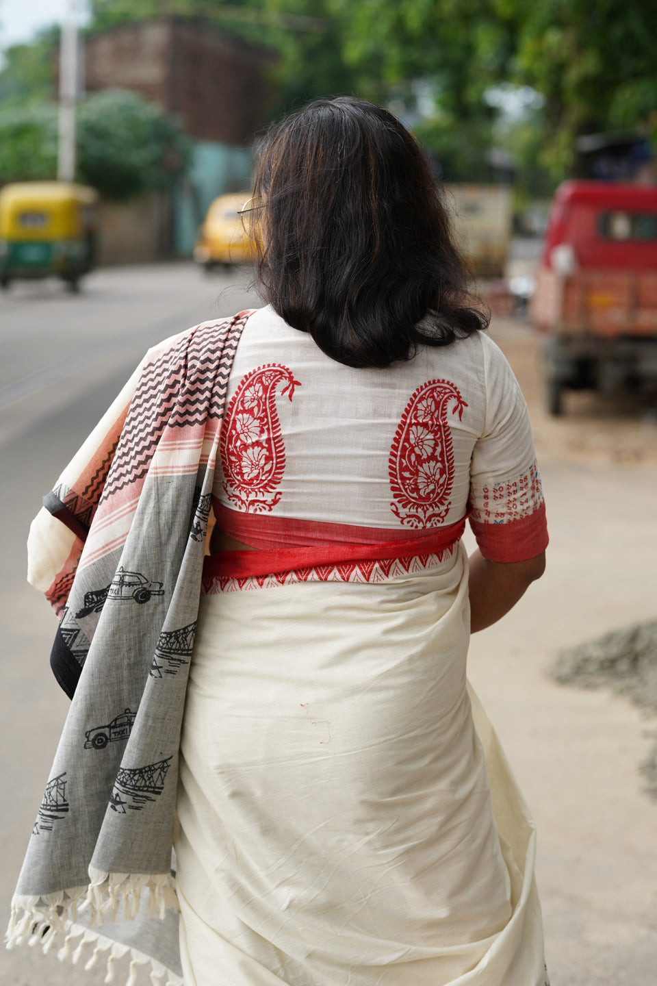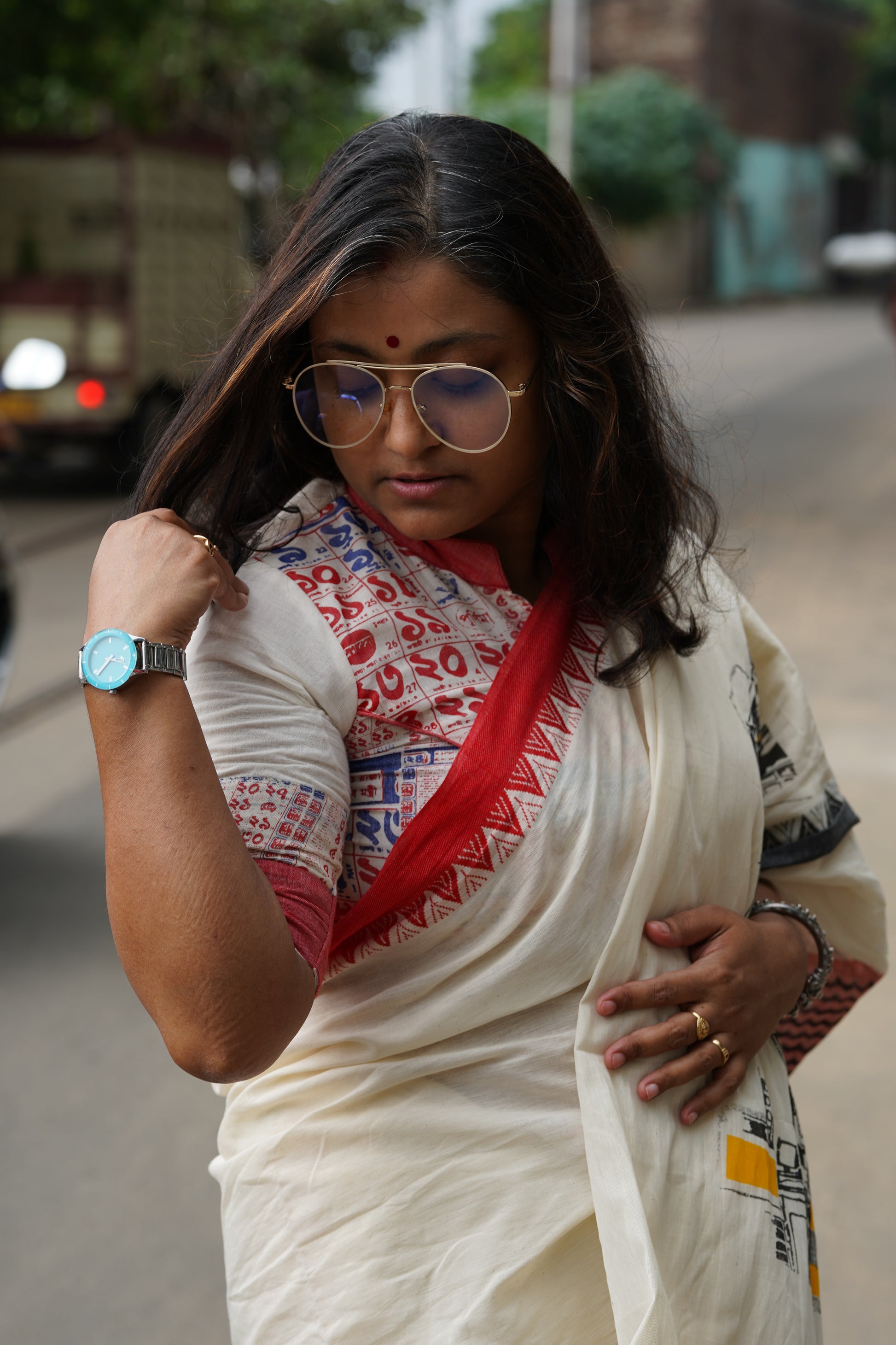 This blouse is made of our signature print, Calender. Paired with Kolkata saree here. We also have a calender saree separately.