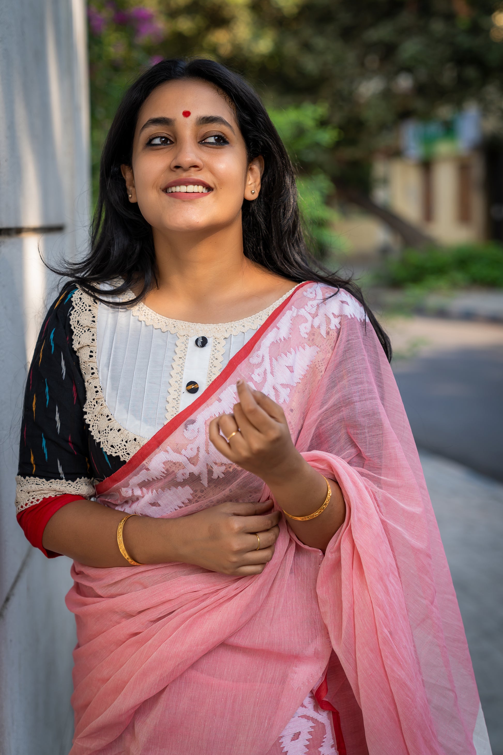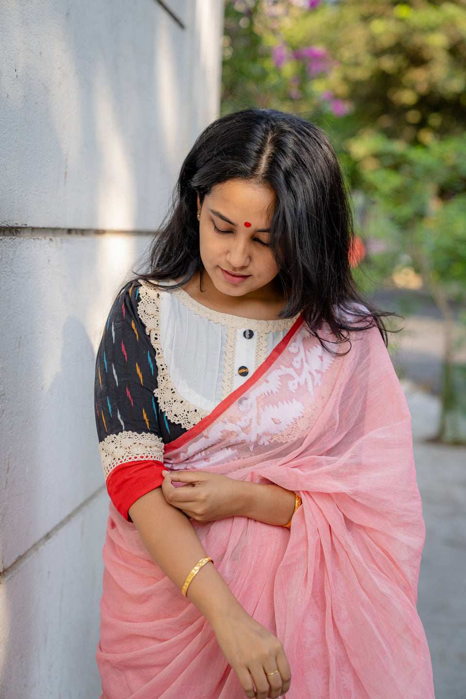 Cotton Ikkat with yesteryears lace detailed collared blouse. There is a white pinstripe pleated yolk portion, that adds to its beauty.
