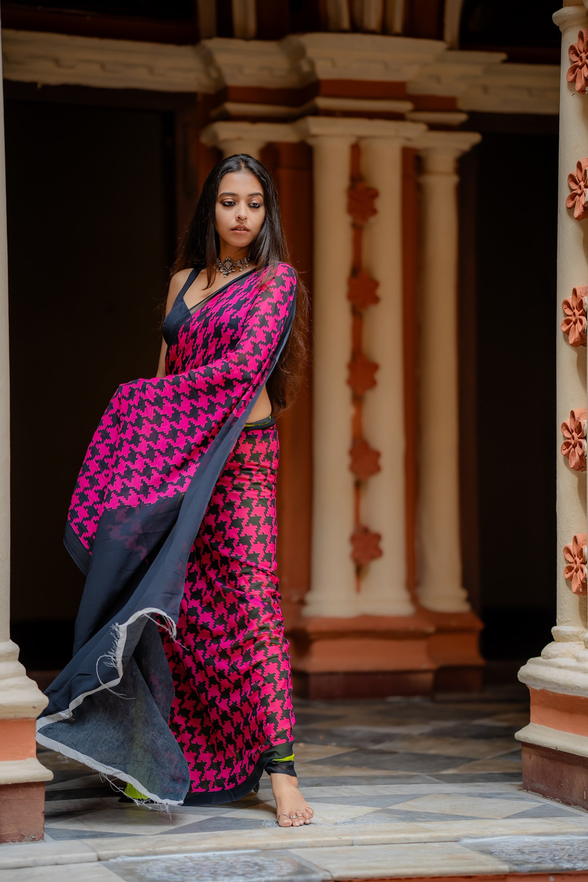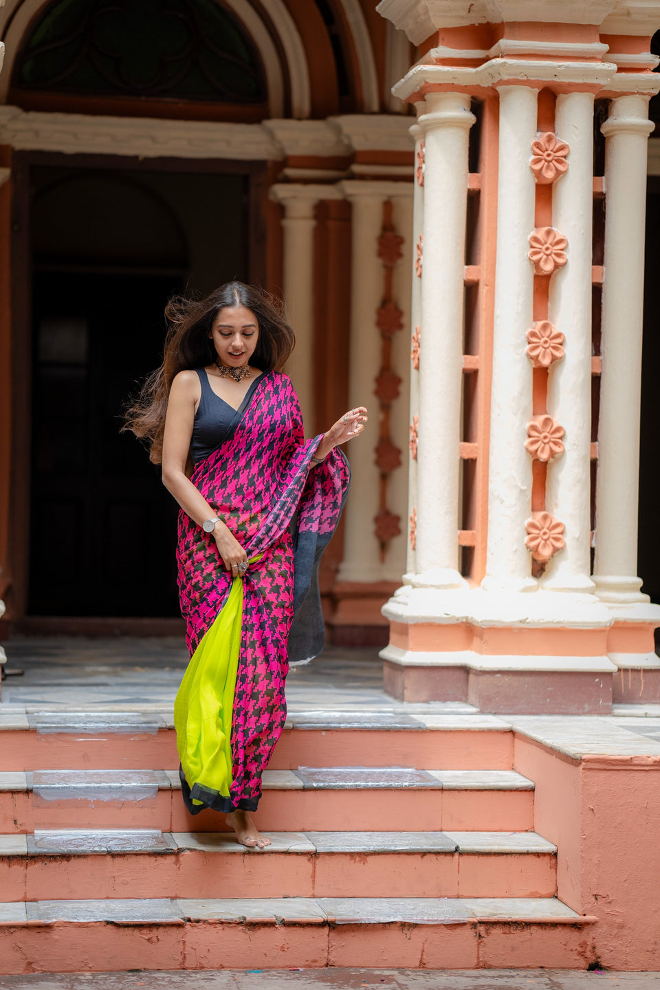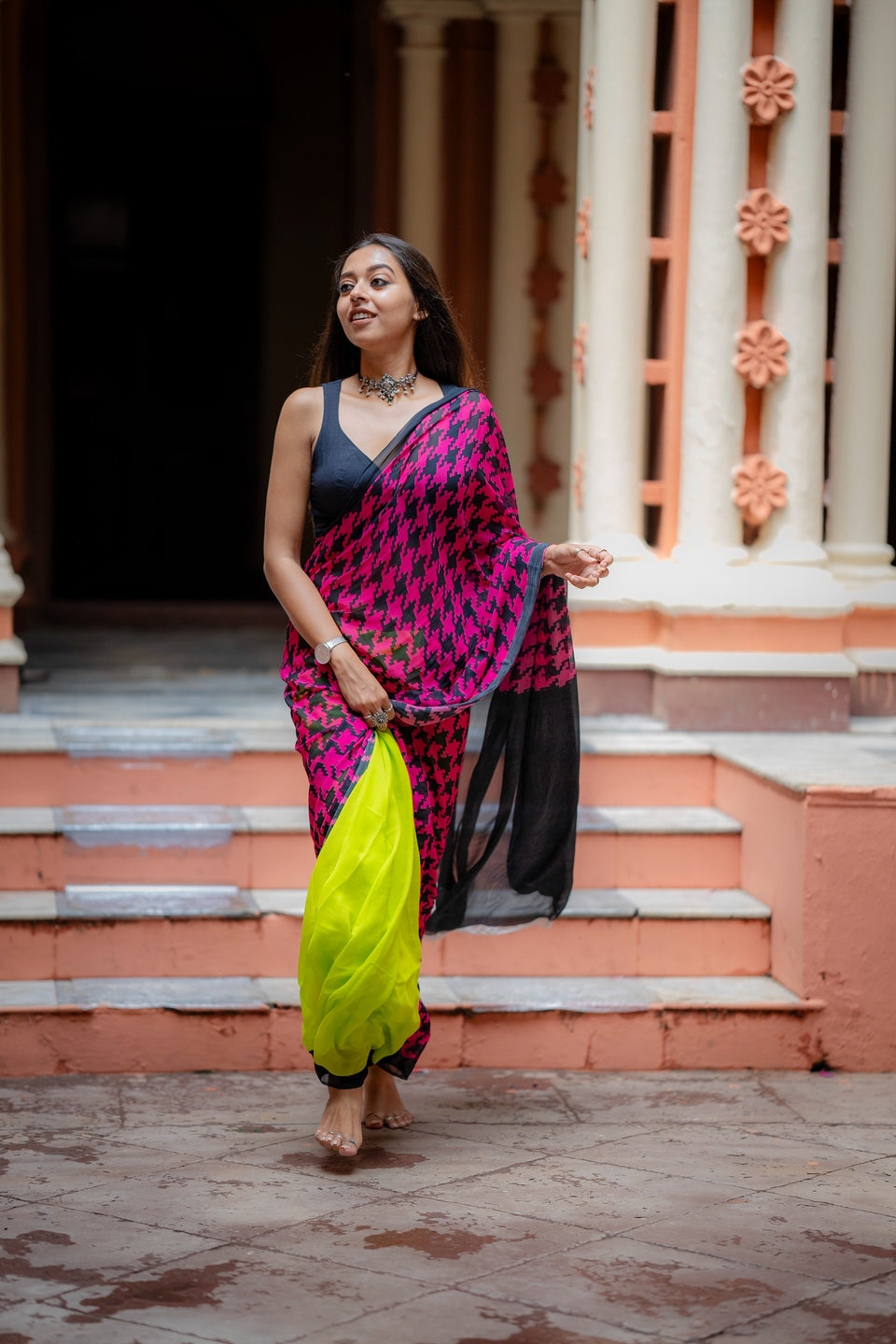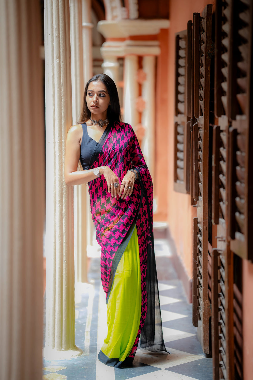 The neon green color with houndstooth print is bold
