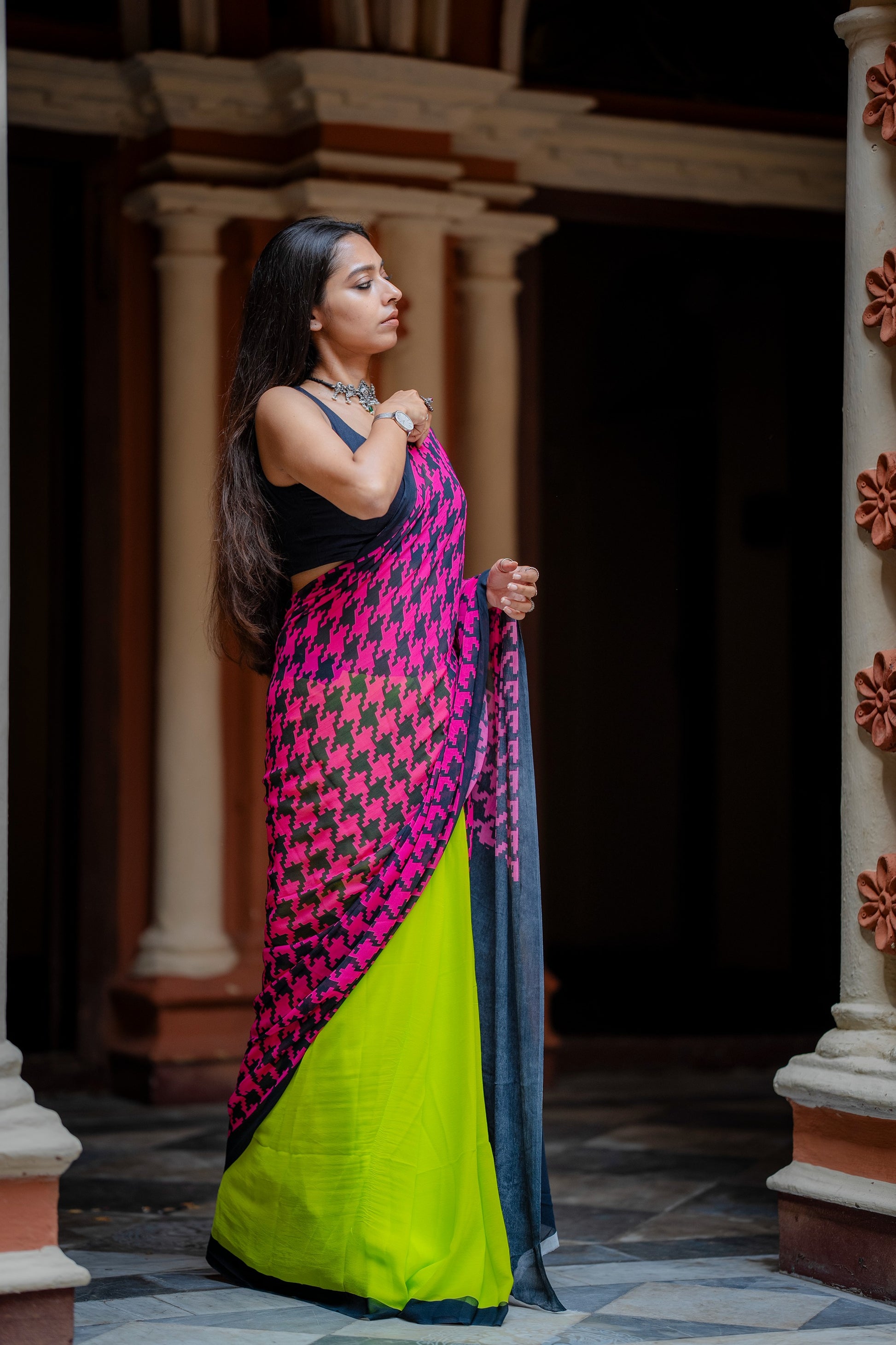 our silk georgette saree and rest of the saree is of solid neon green colour to