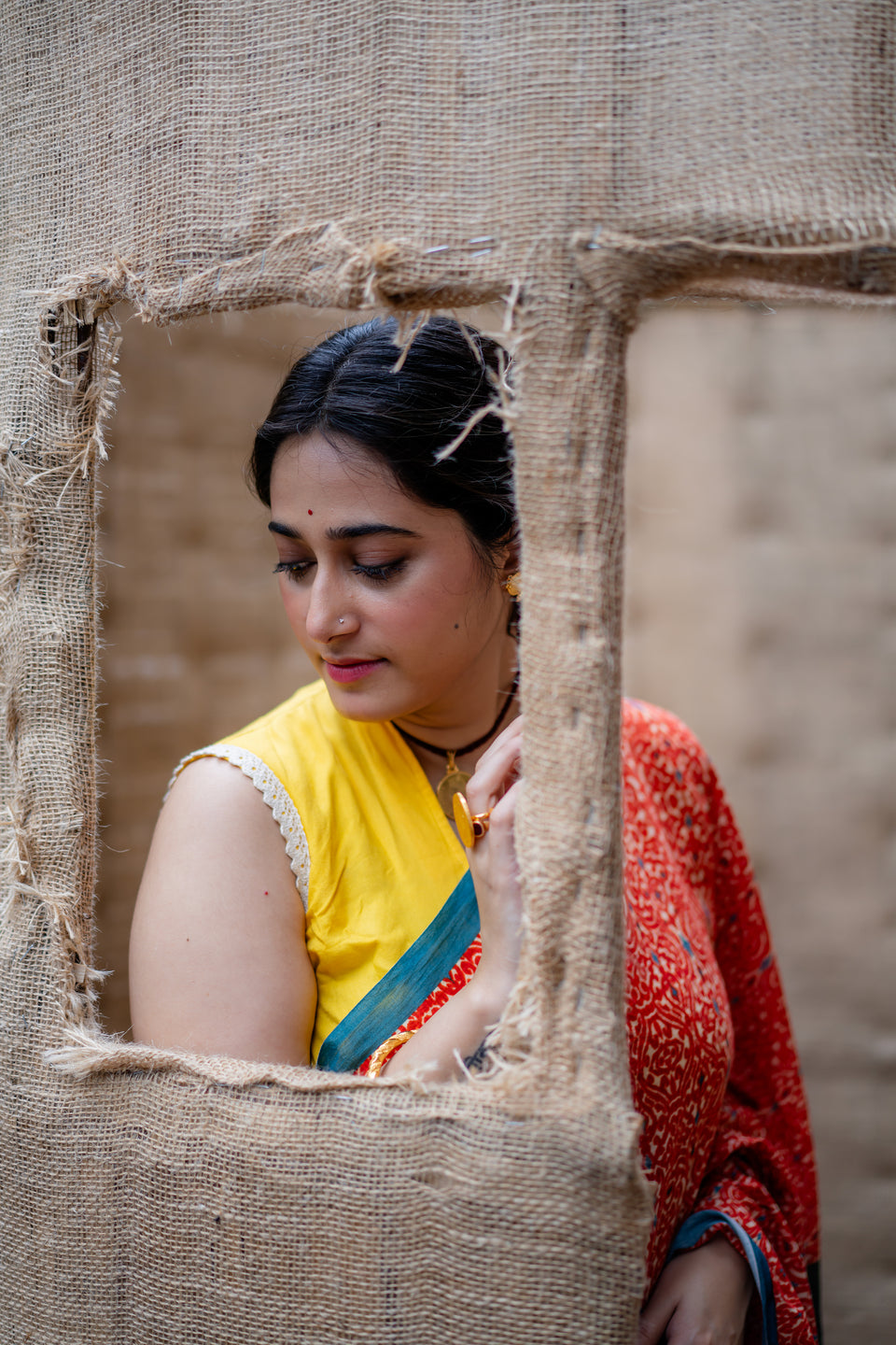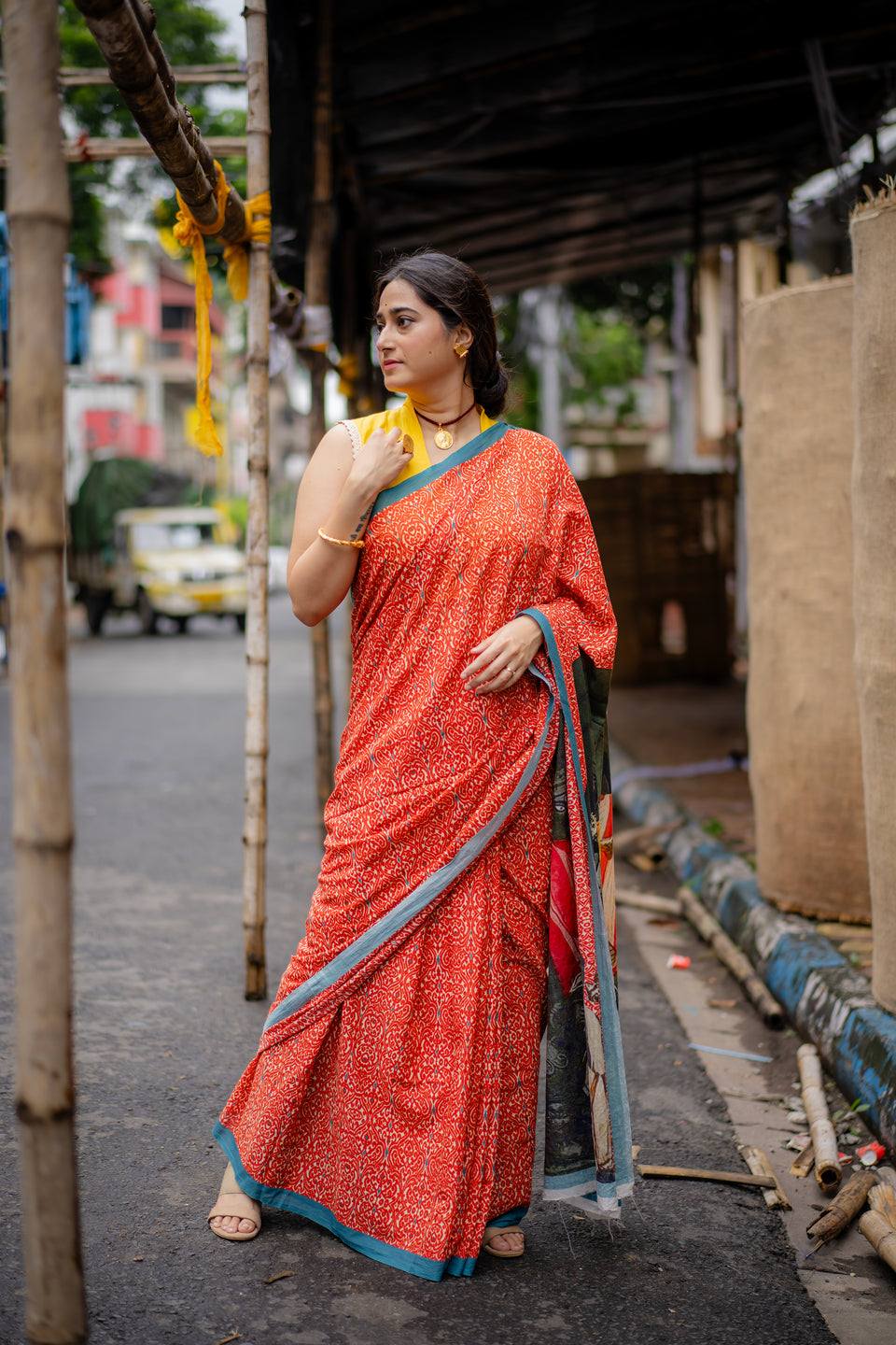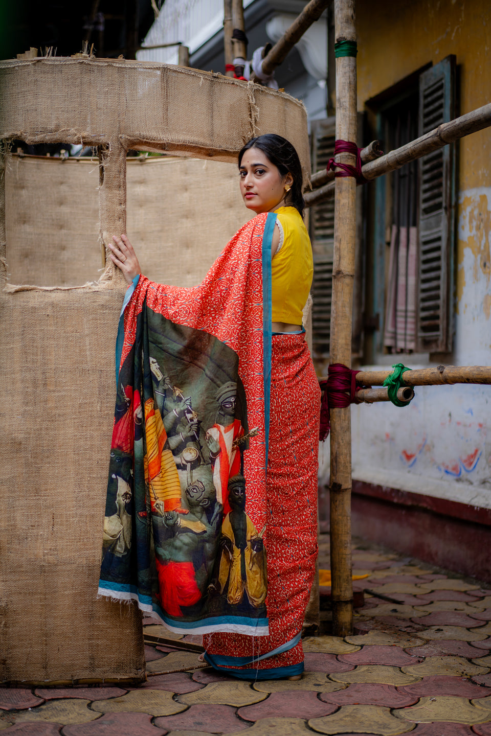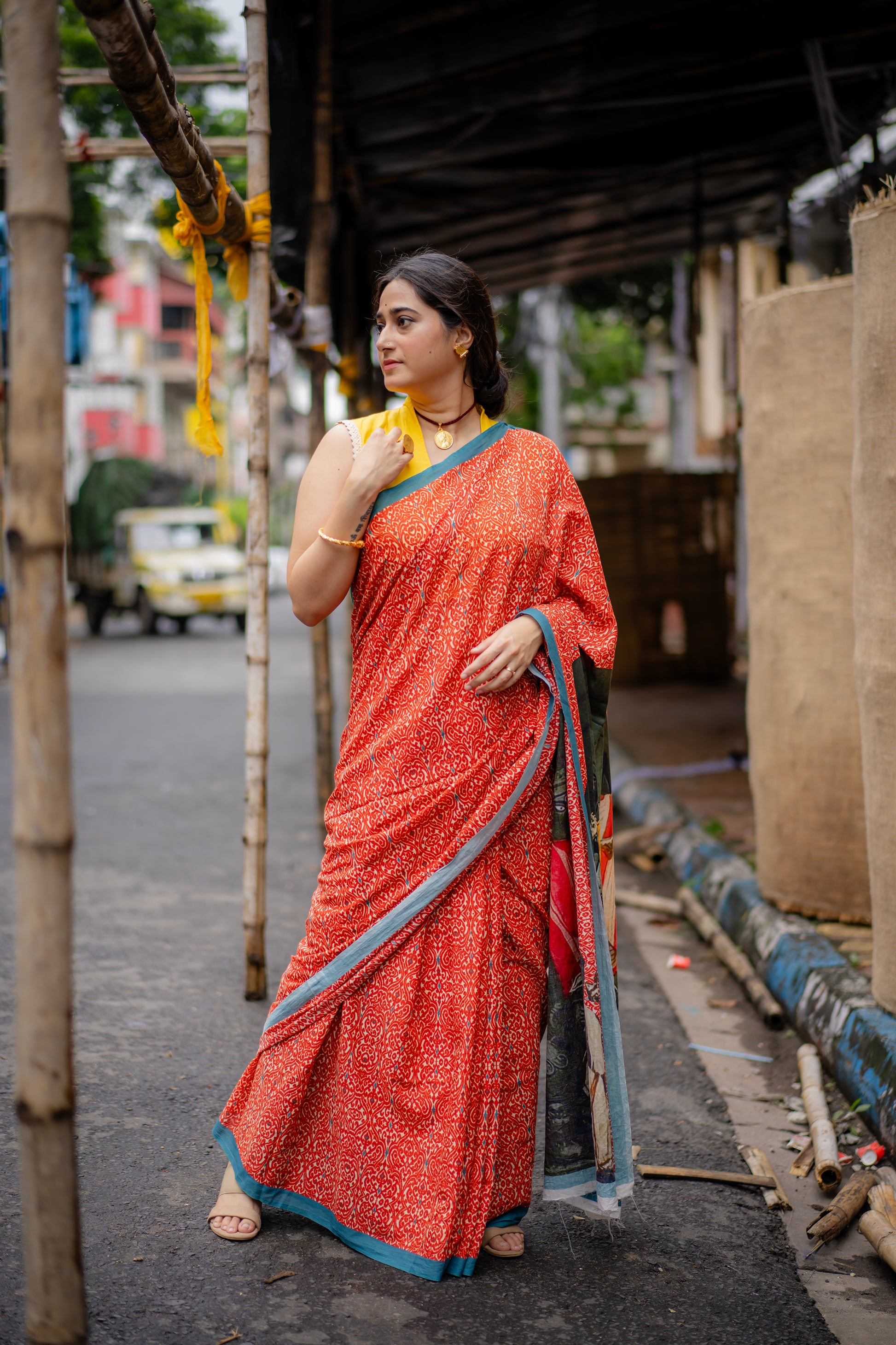 Handspun handwoven cotton saree, digitally printed. Length 6 mts, Width 50 inch, Blouse piece : No