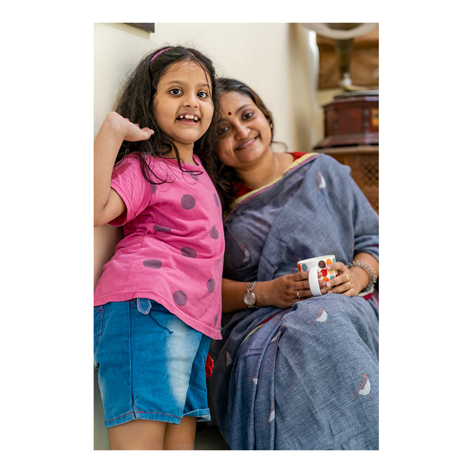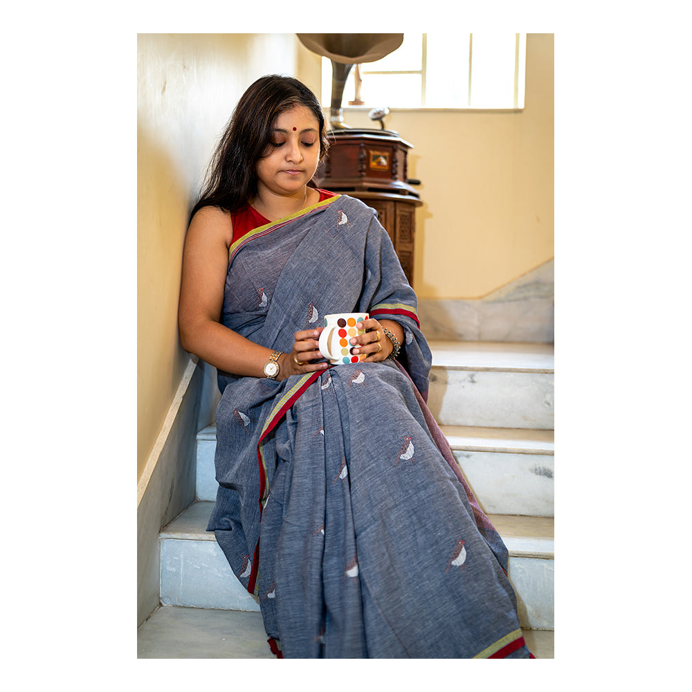 The saree is a handwoven Jamdani on cotton. Tiny sparrows are woven on the body by extra weft. Avialable in 4 colour options, white, mint green, pink and grey. Comes with blouse piece.