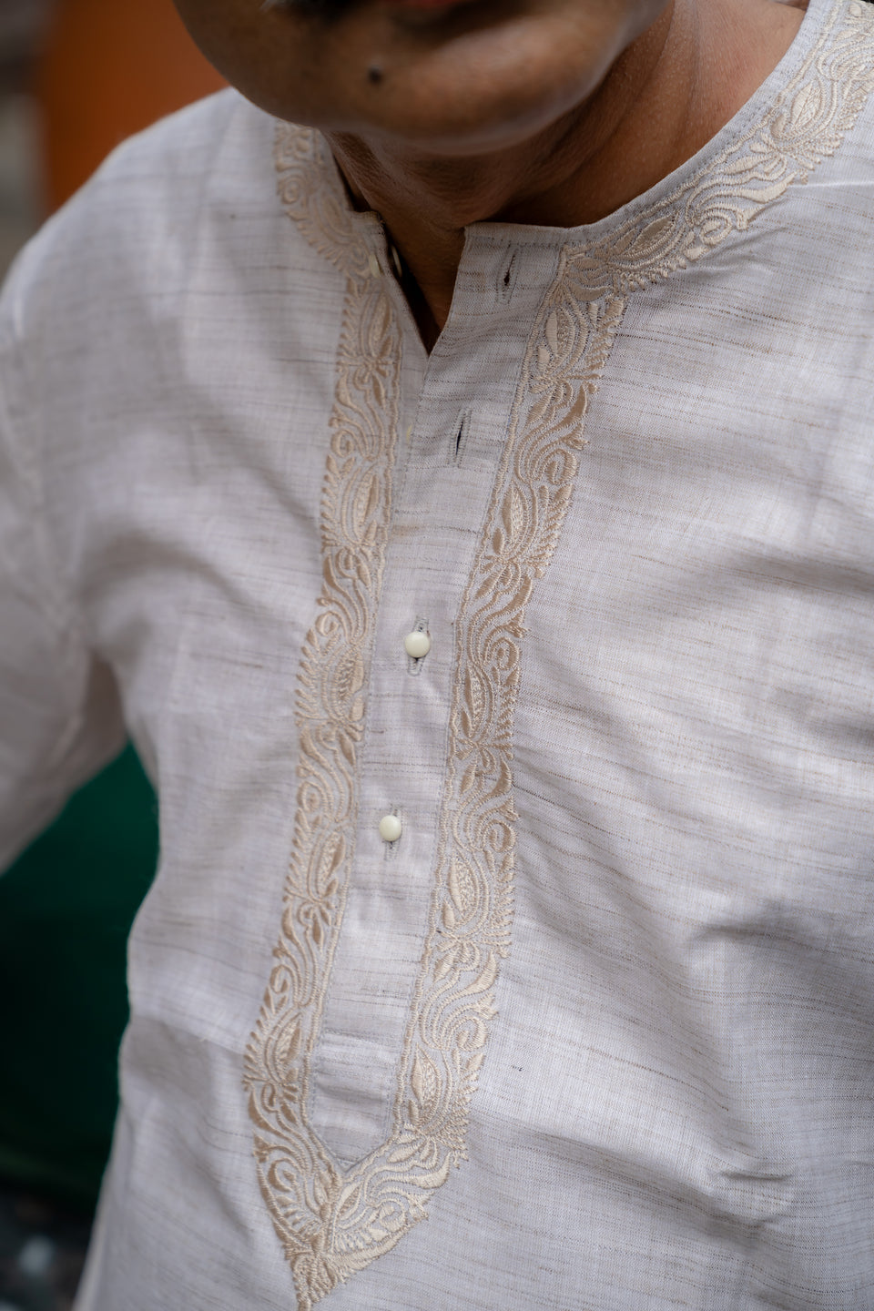 The kurta is a typical bengali style, round neck with self coloured embroidery.