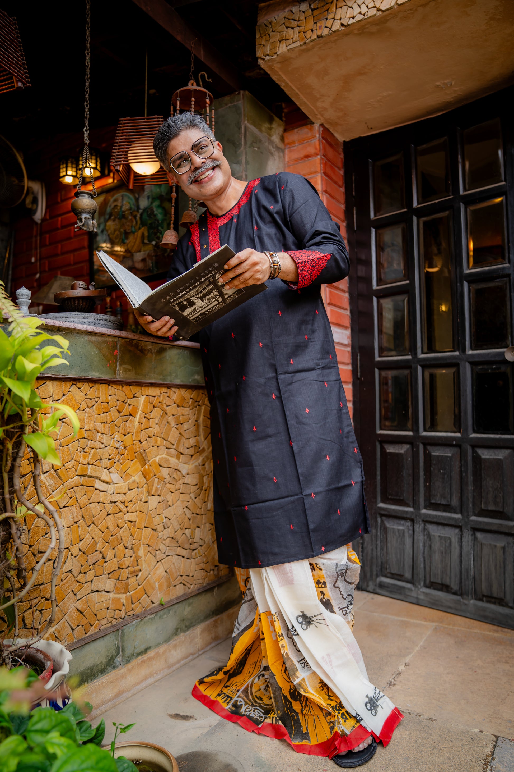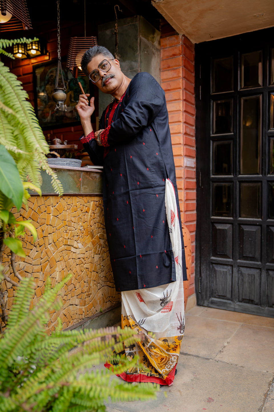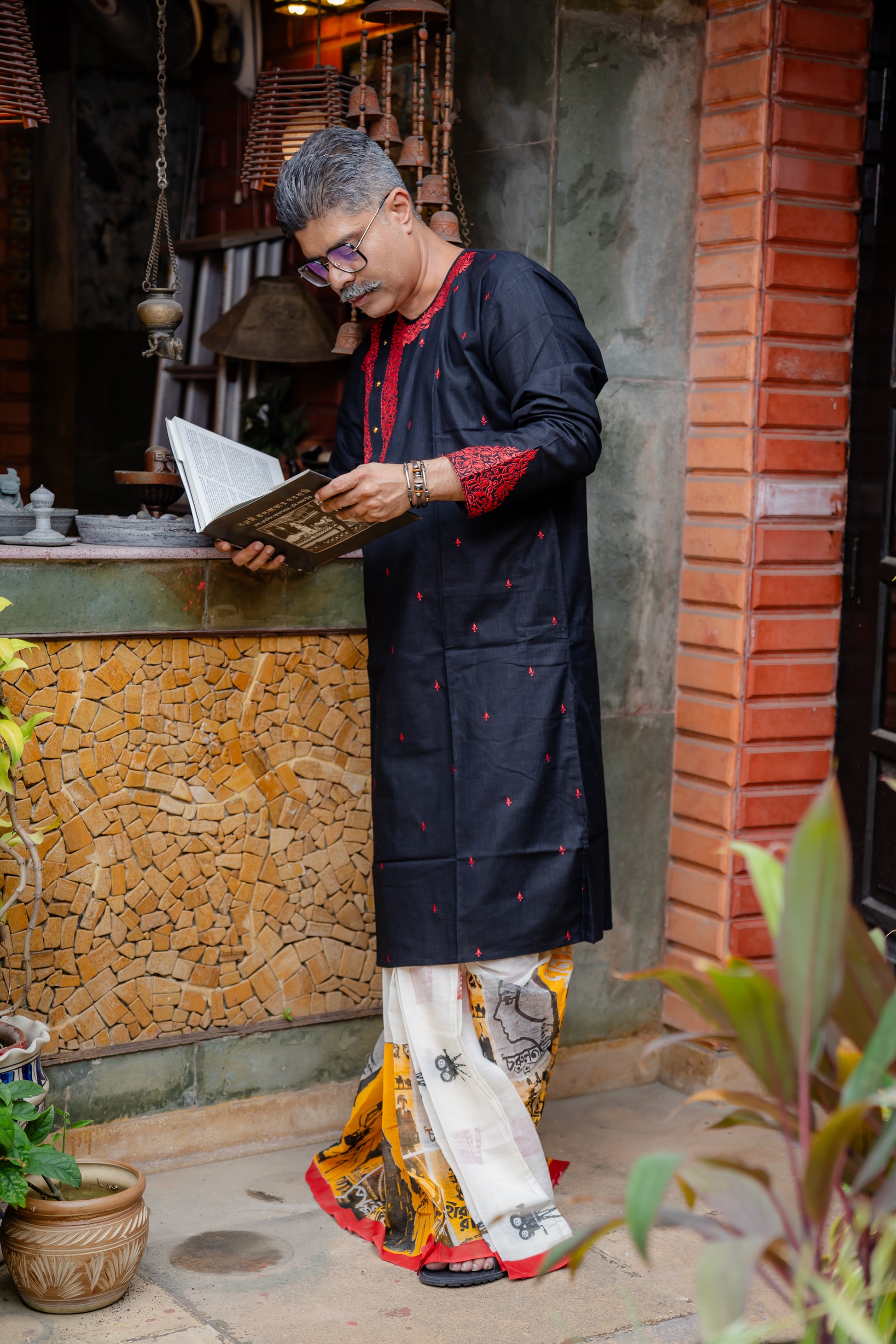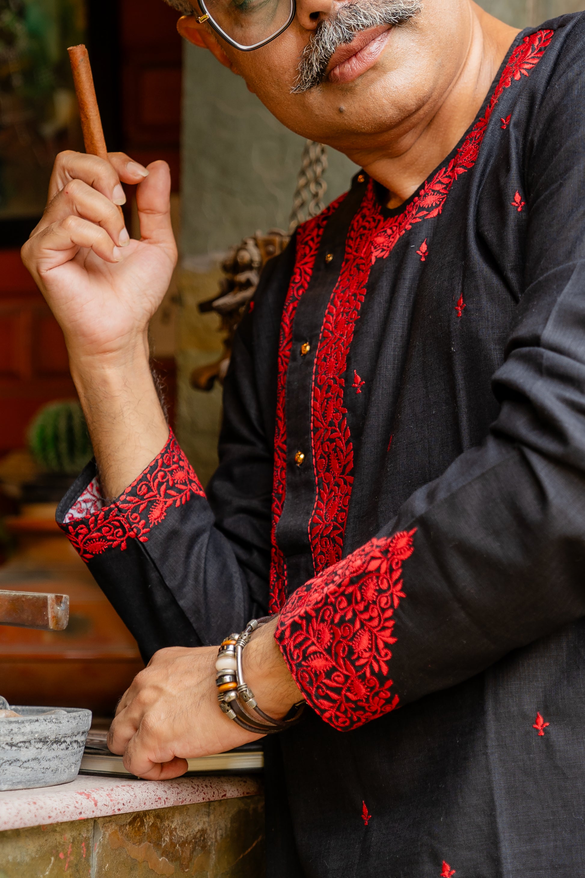 A regal black cotton silk kurta with embroidered patterns in red silk threads.