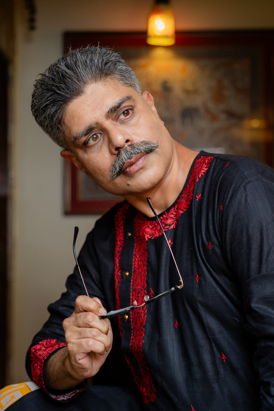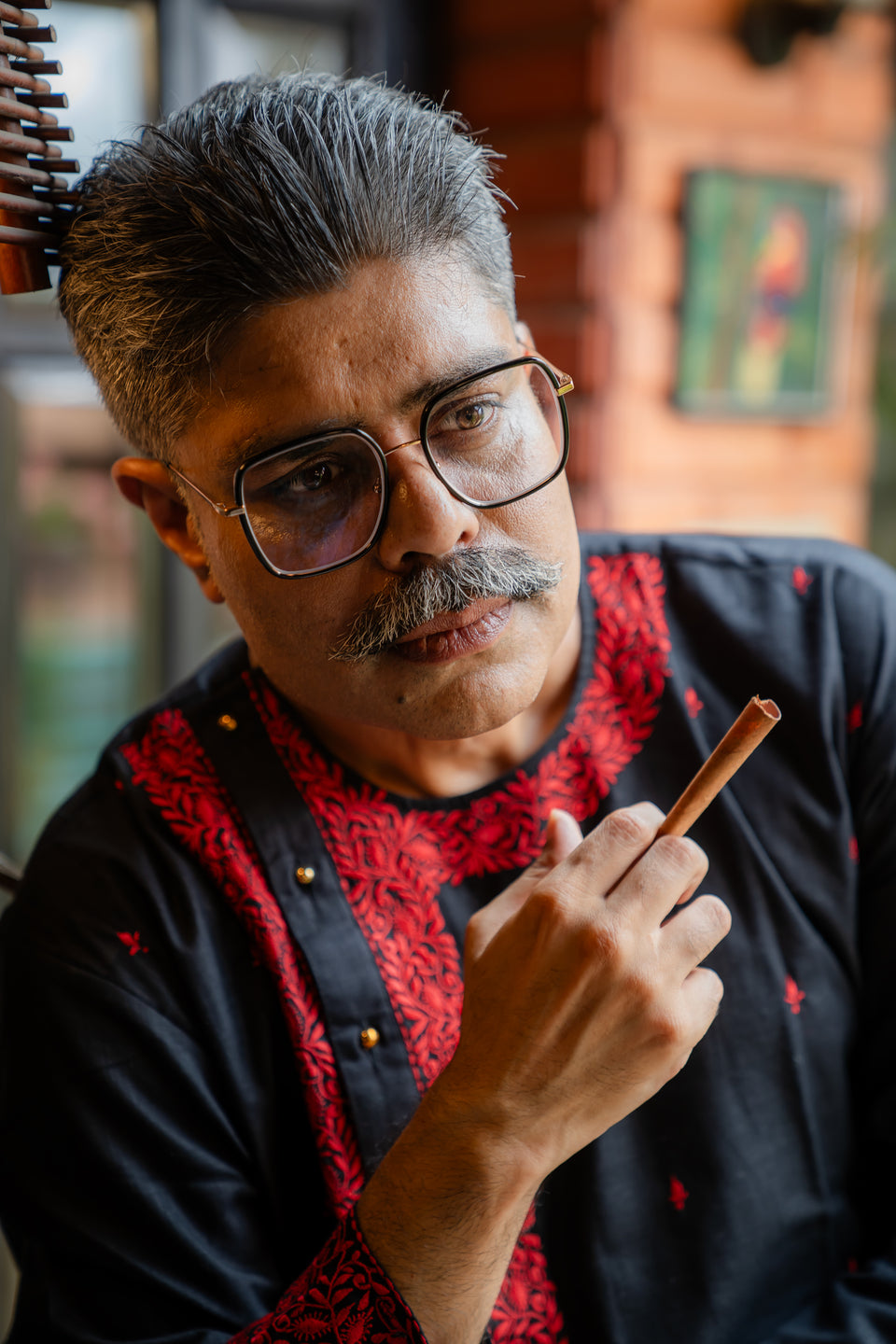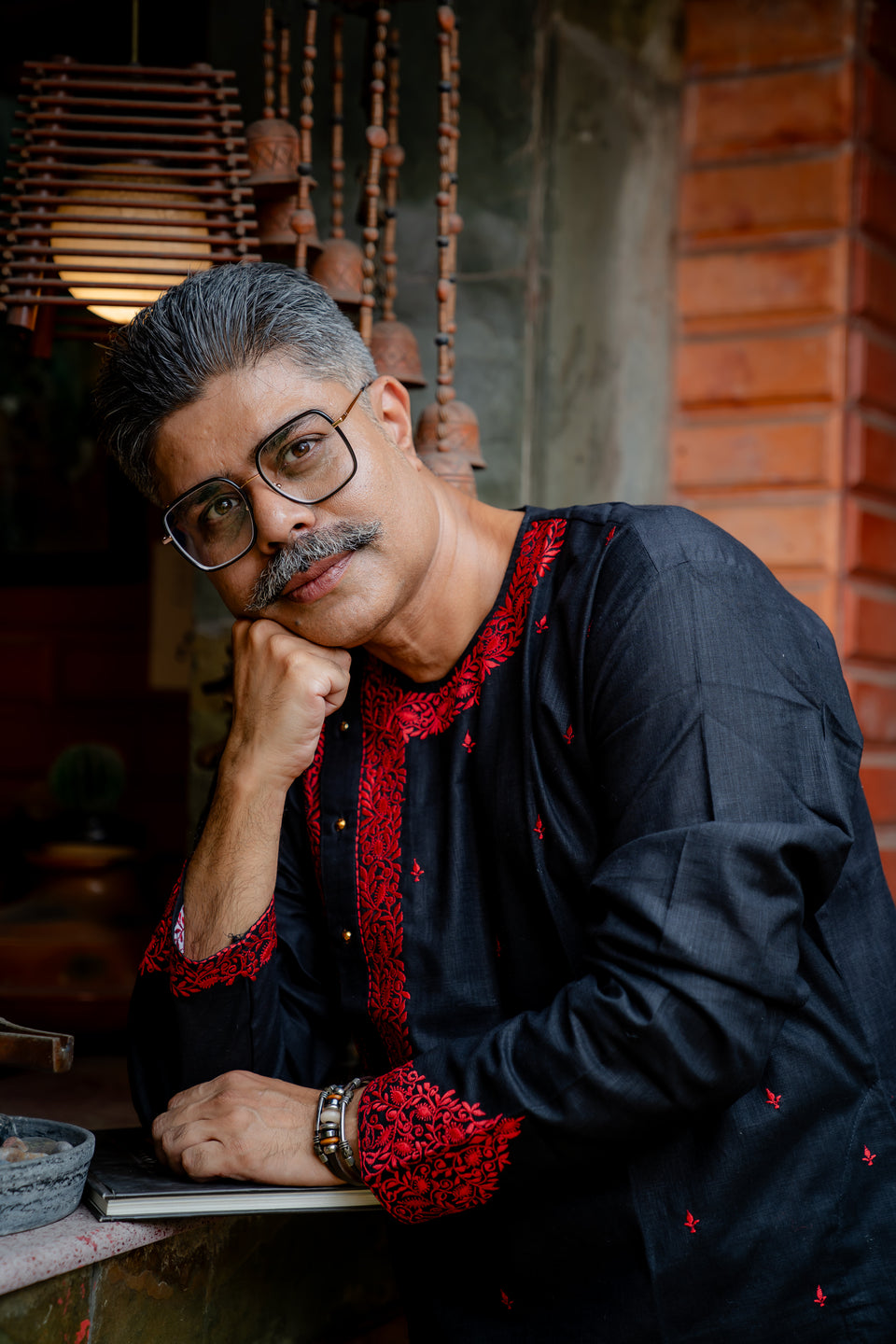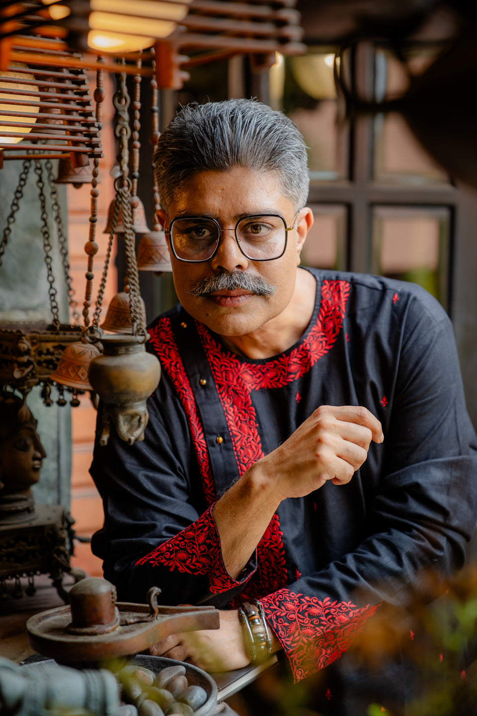 A regal black cotton silk kurta with embroidered patterns in red silk threads.