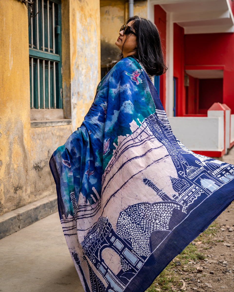 This batik cotton saree captures the essence of Delhi, showcasing its iconic skyline, old Delhi's charming streets, and bustling scenes with pigeons and vintage vehicles. The intricate design weaves together the city's vibrant spirit and historic allure, offering a timeless tribute to Delhi's unique character.