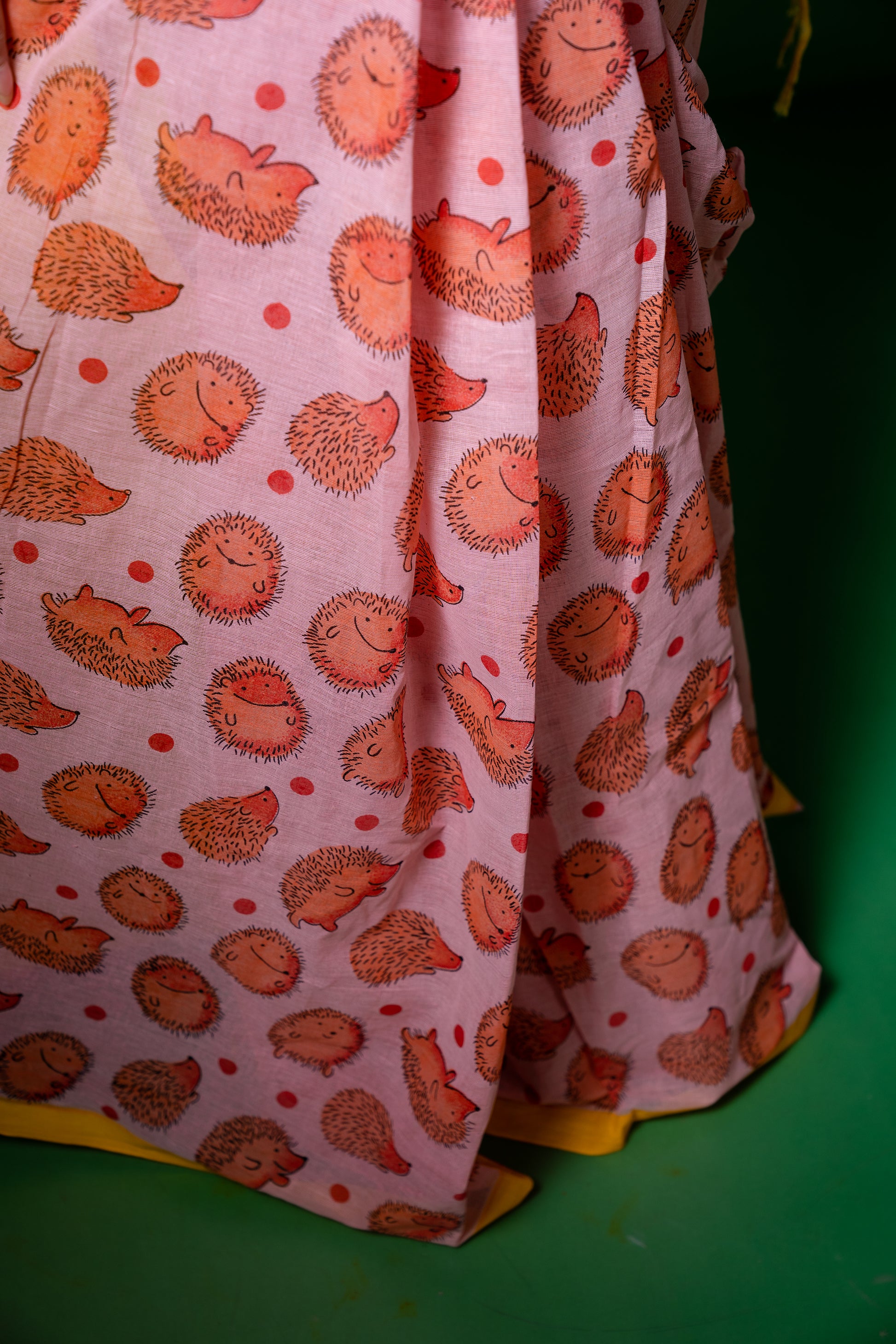 This peach pink cotton saree features a unique porcupine print, blending playful design with elegant simplicity. Ideal for a stylish and whimsical touch.