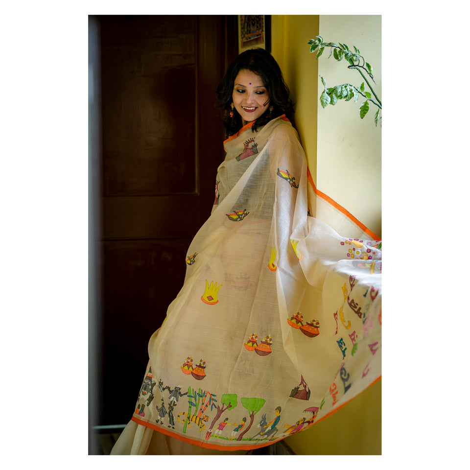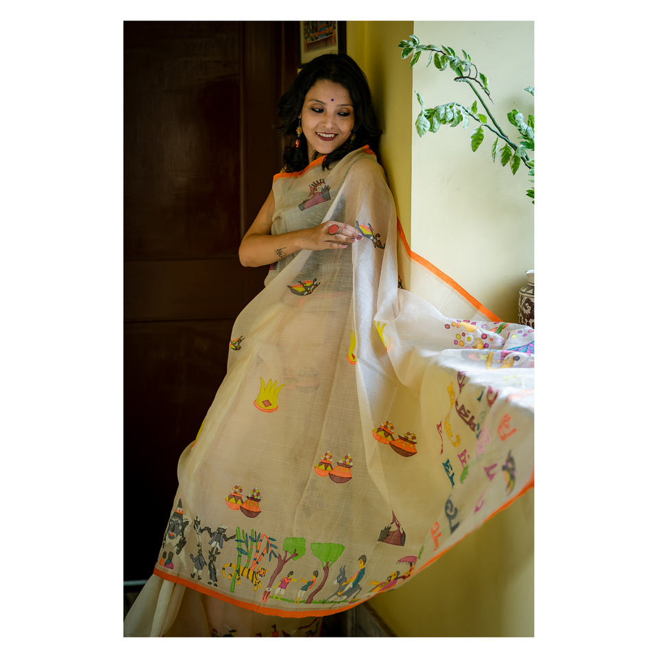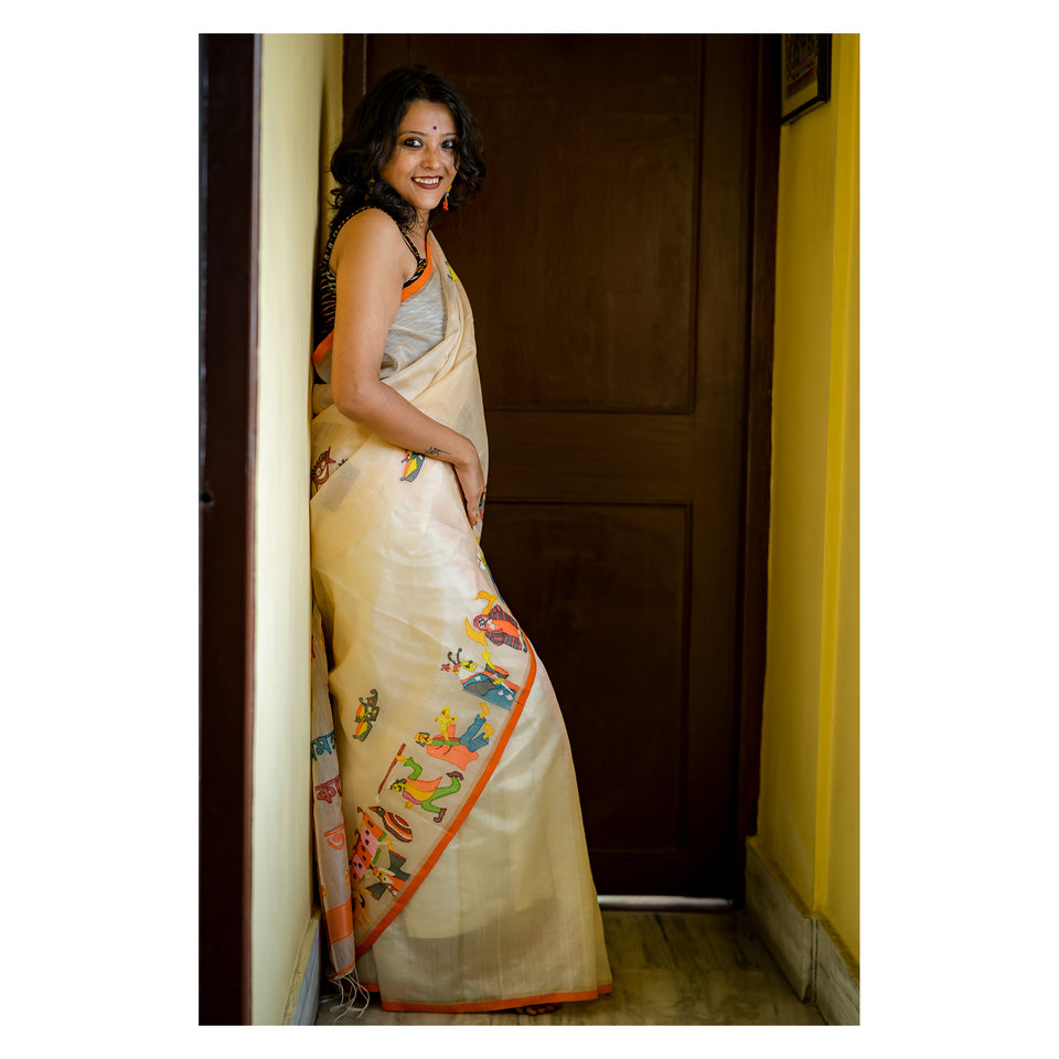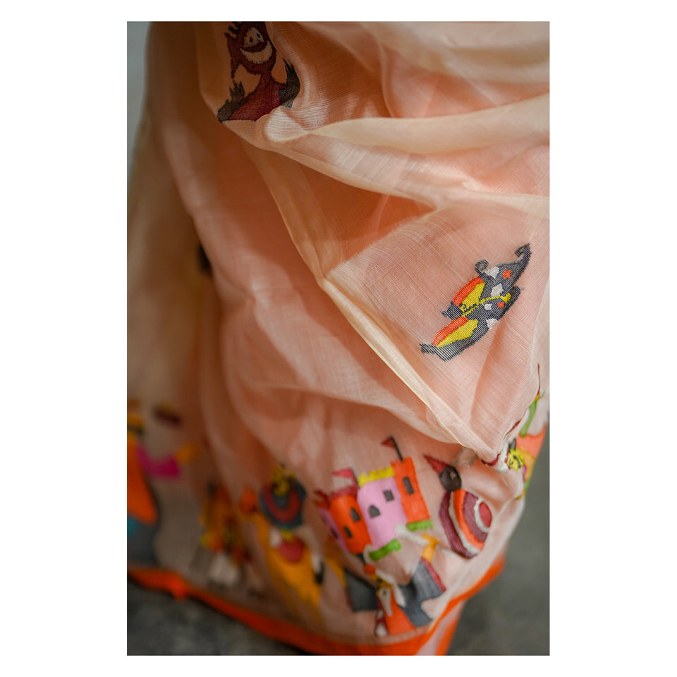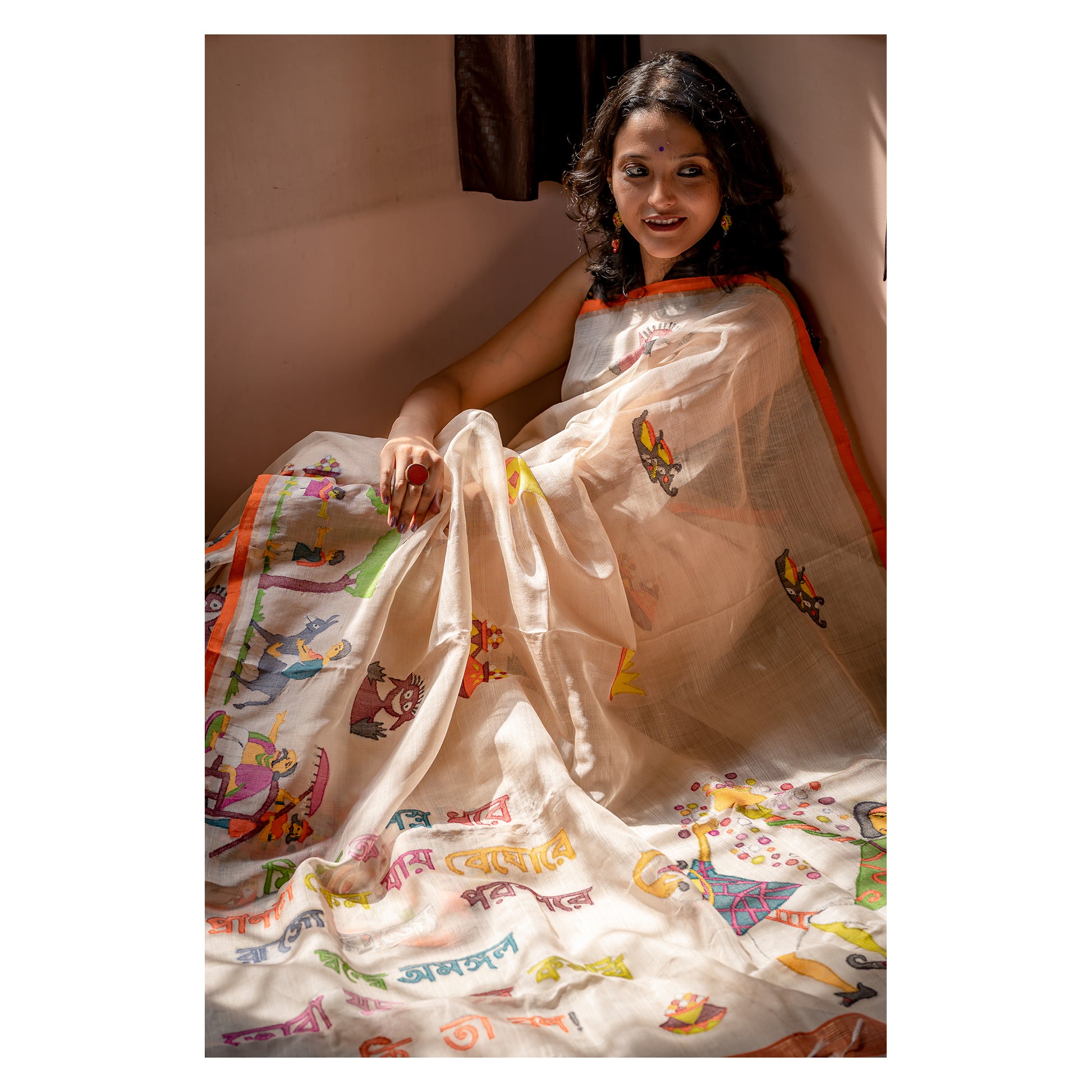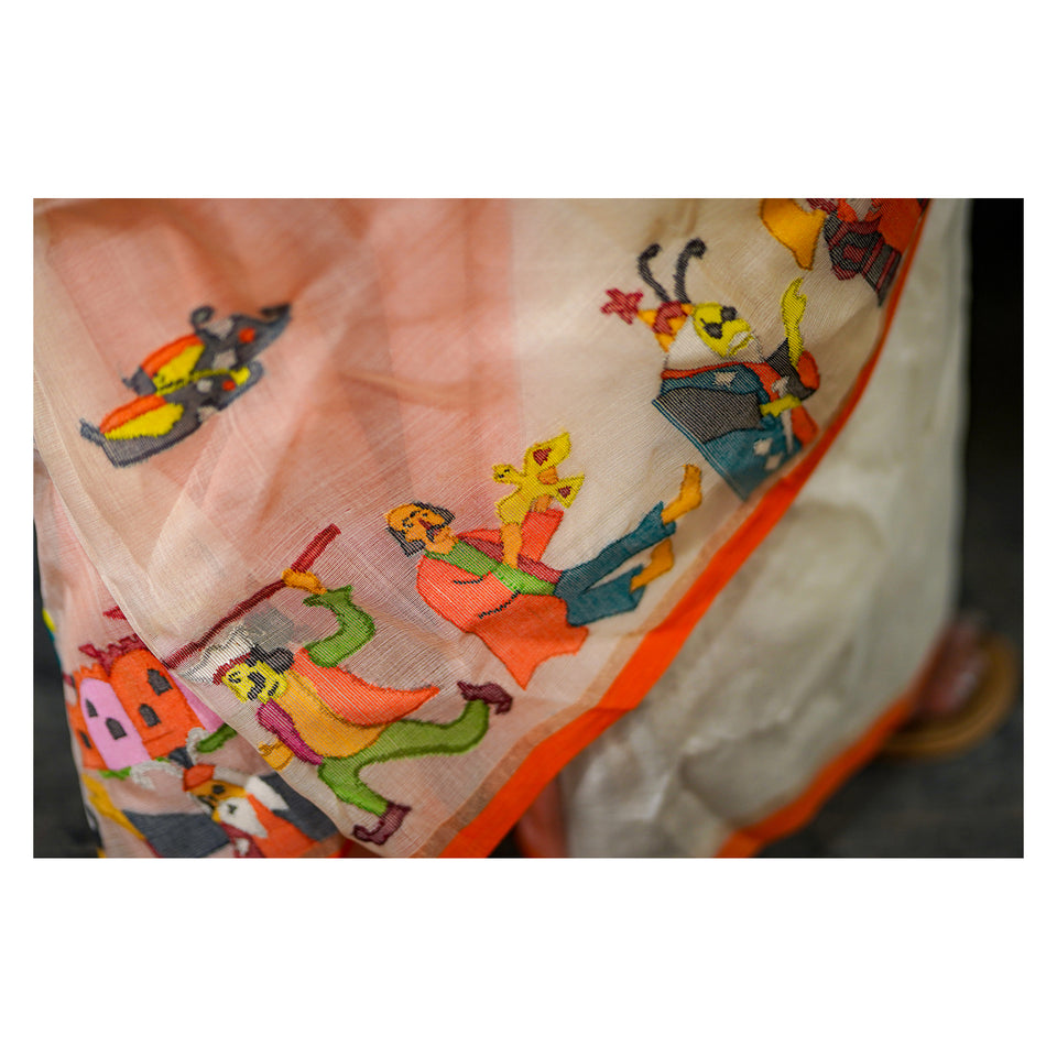 The saree is a handwoven Jamdani on fine resham, with woven motifs depicting the story of Goopi Gayen Bagha Bayen. Done only on preorder. Comes with blouse piece