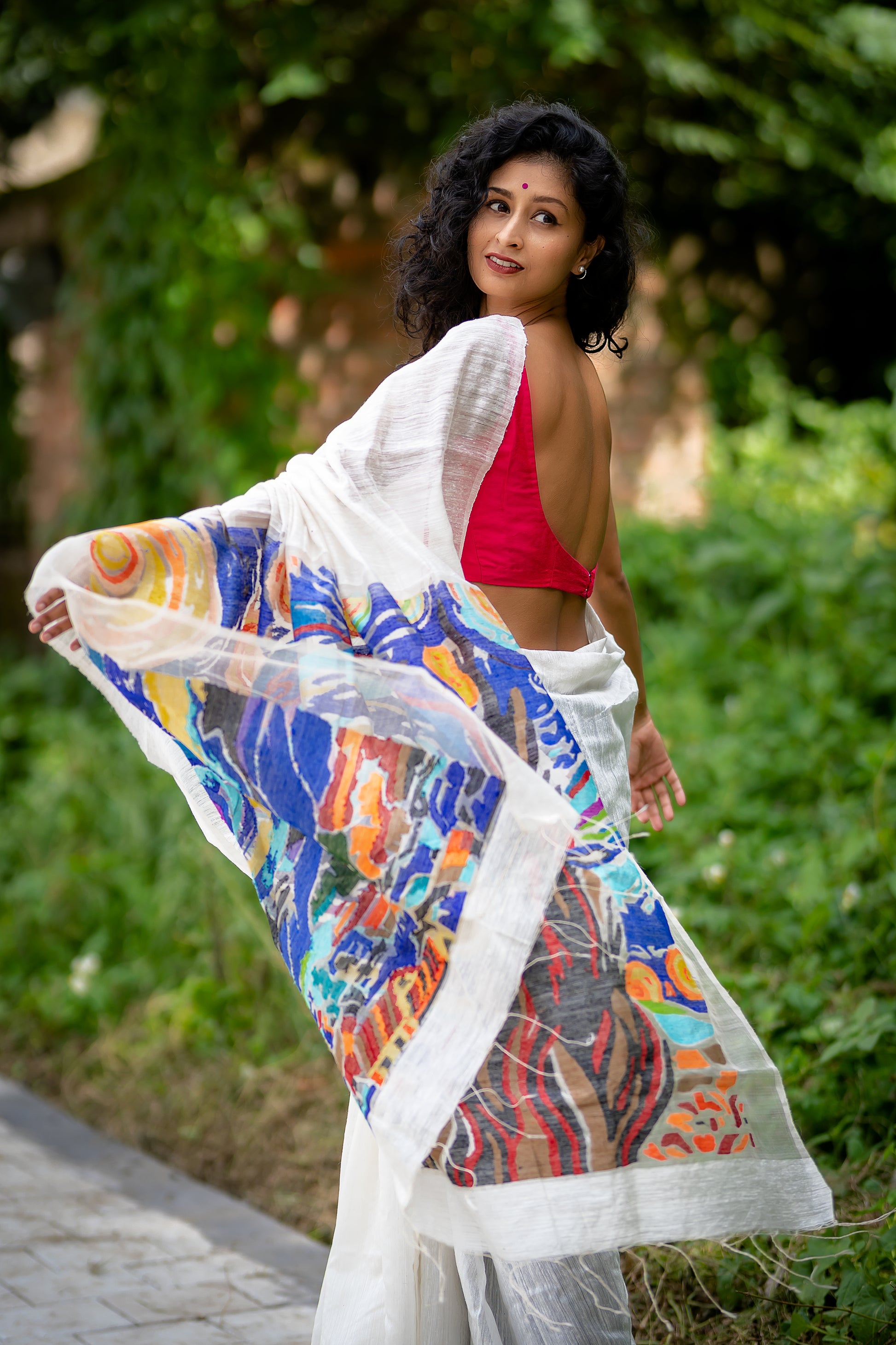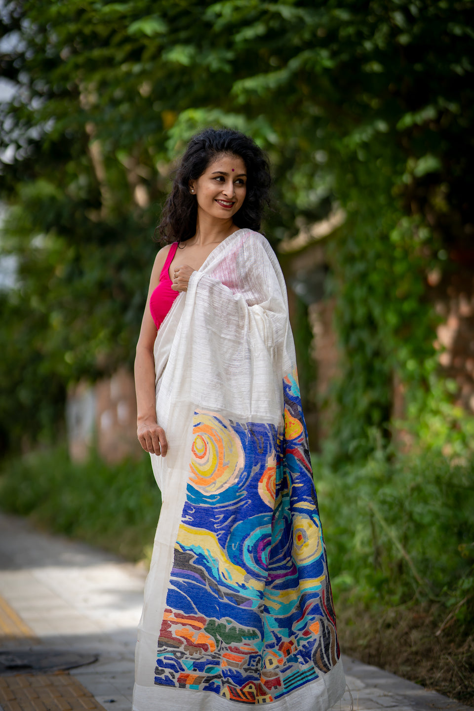 The saree is a handwoven Jamdani on Matka silk. Van Gogh’s Starry Night has been woven on painstakingly on the anchol. Woven only on preorder. Available in 3 colour options of Blue, White and Black. Comes with blouse piece.