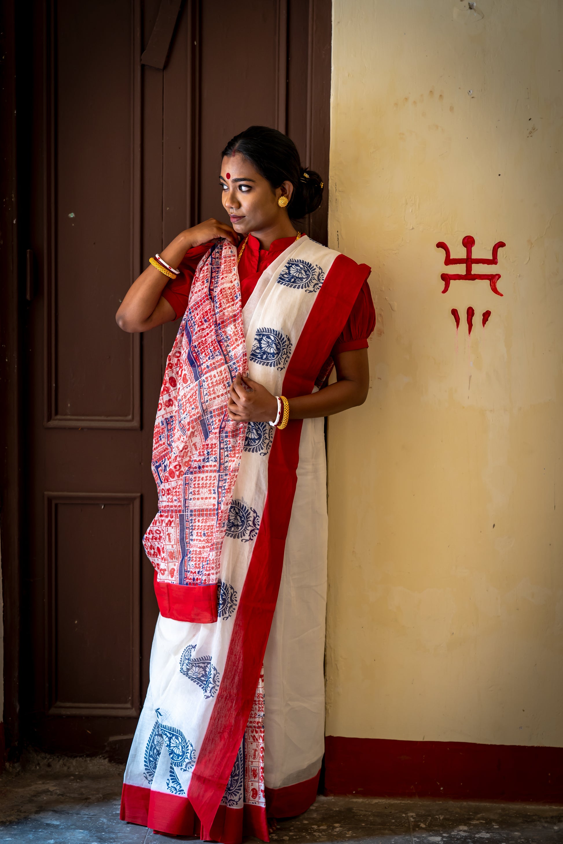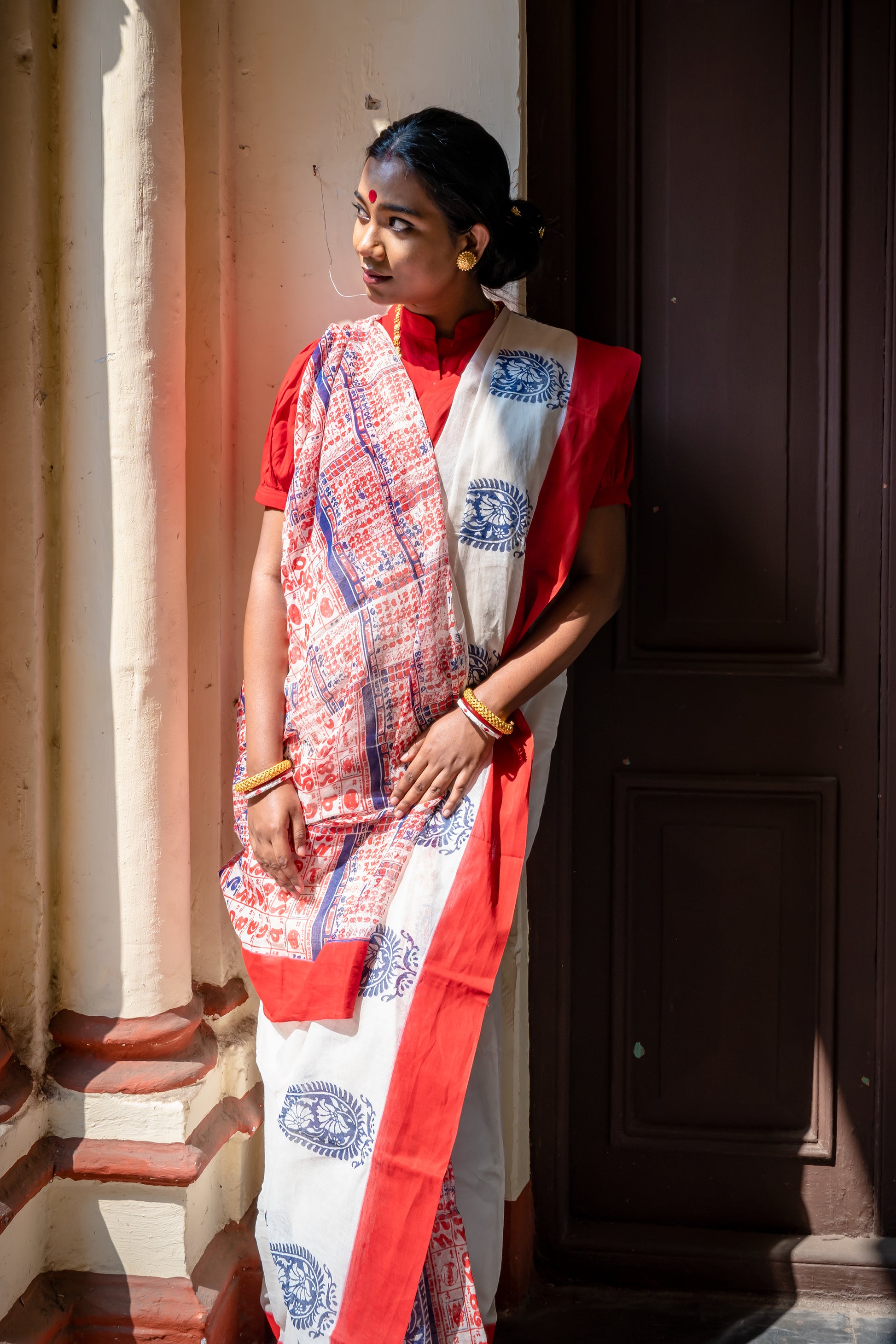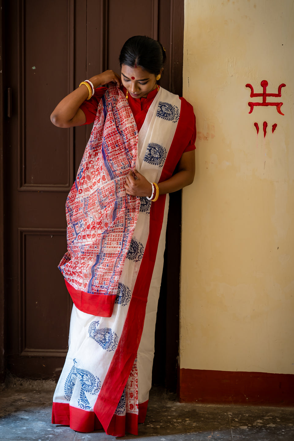 Bengali New Year starts with Haal khata, mishti mukh and Bengali Calender. Old calenders become scarp papers for noting grocery lists. Calender saree is just like that timeless emotion. Screen and handblock printed on handspun handwoven cotton this saree is definitely a keepsake for all Bengalis.