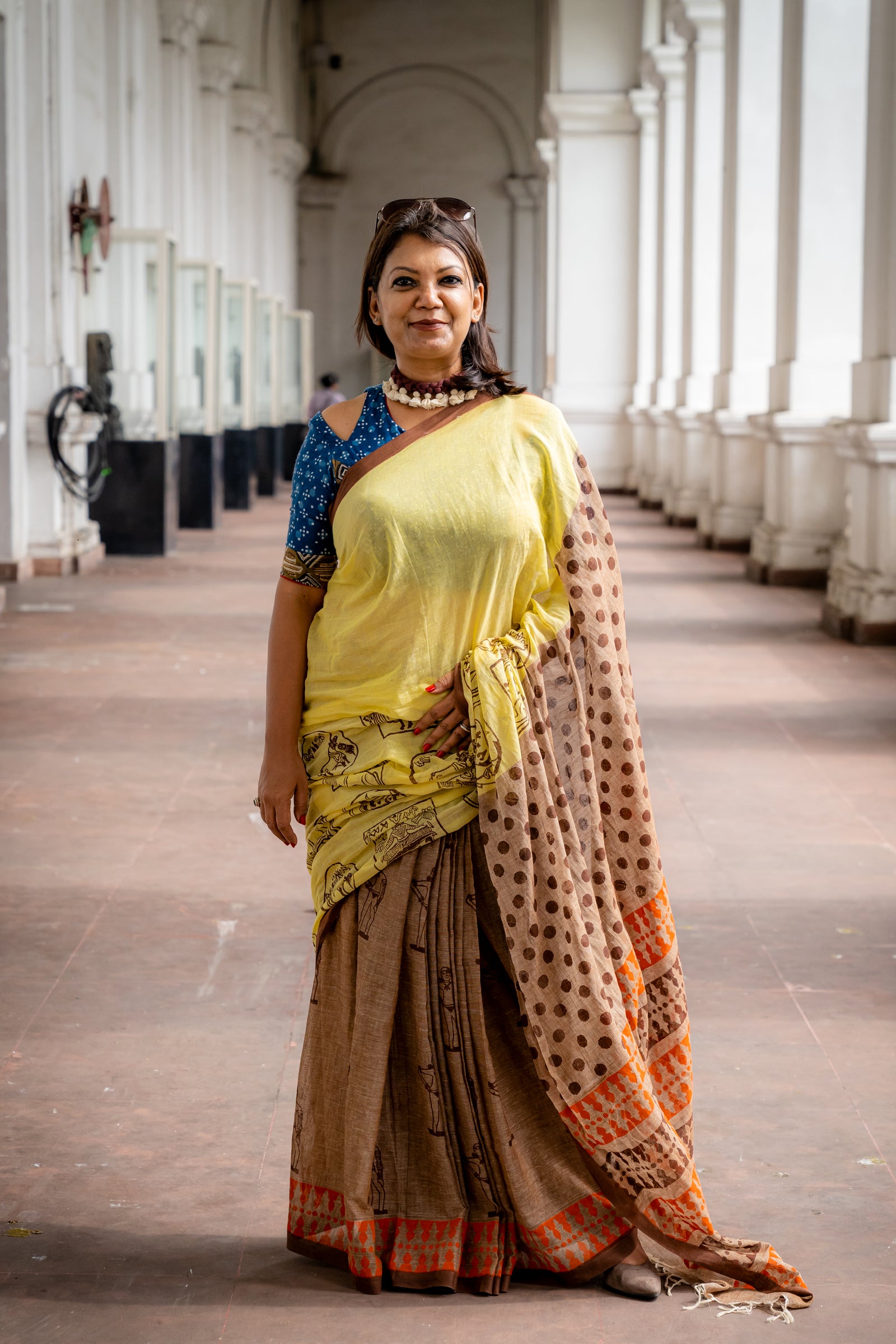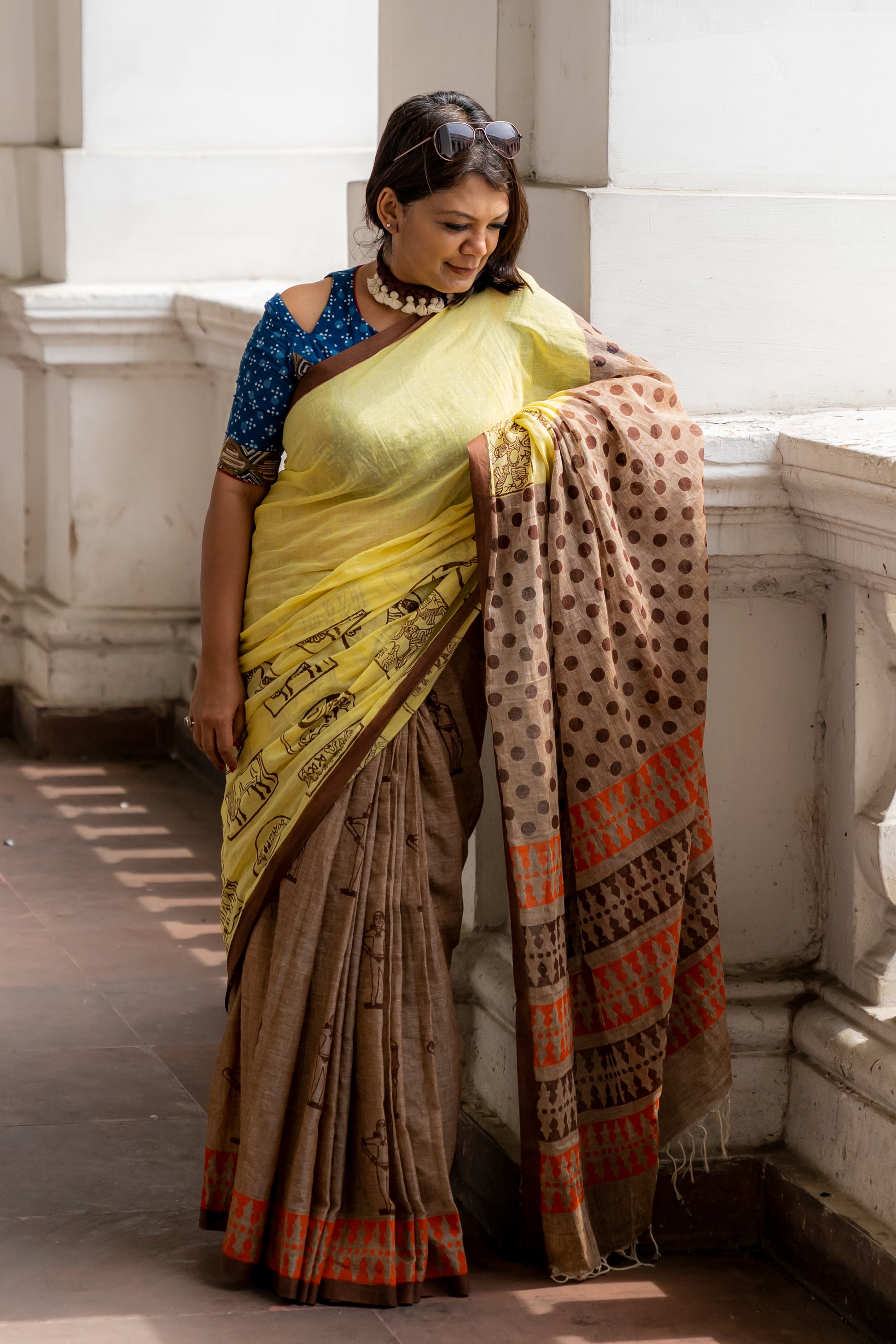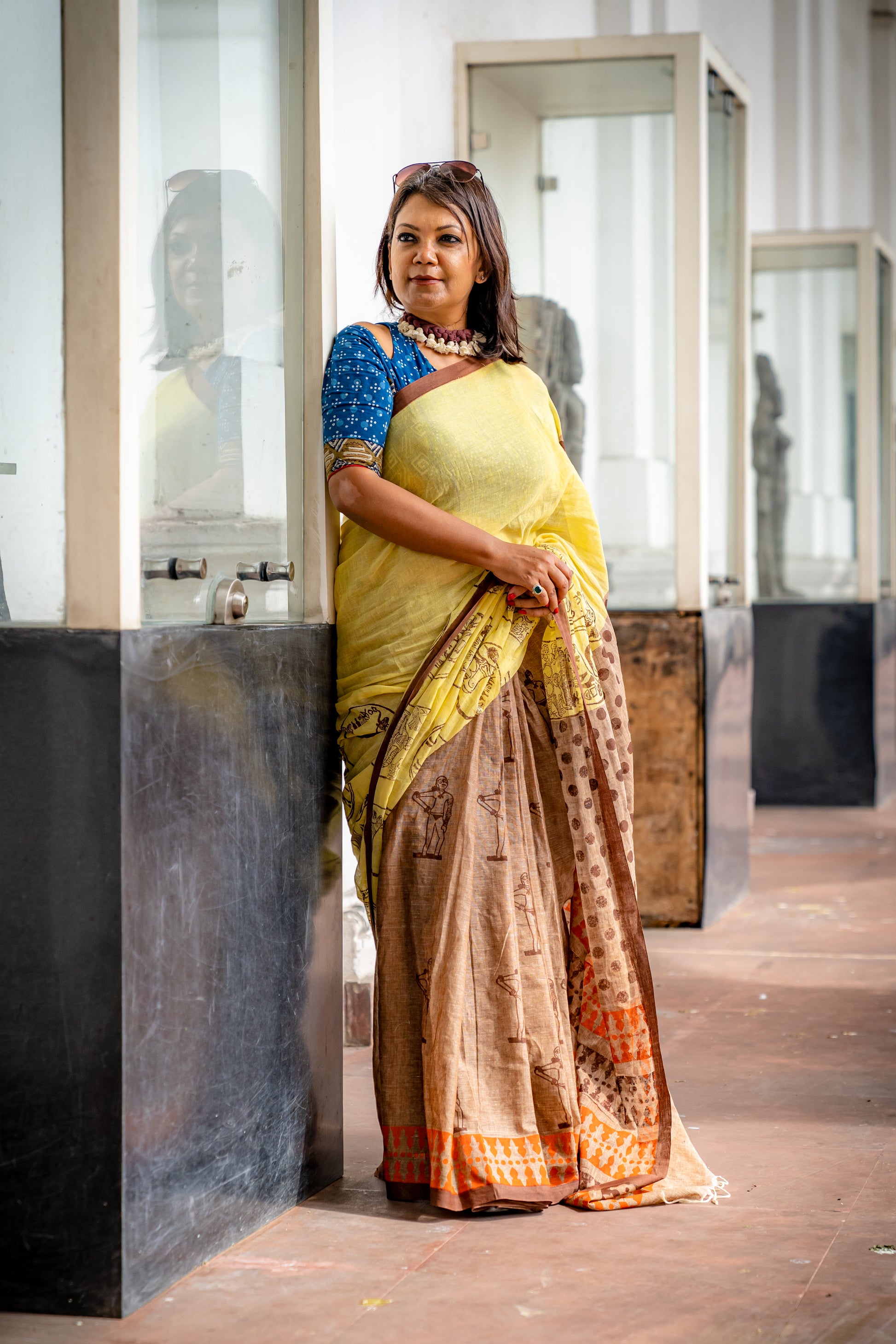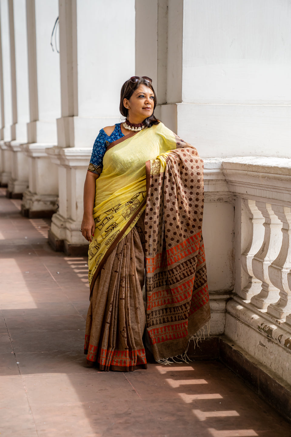 Indus valley civilization and Harappa Mohenjodaro always fascinated me. Learning about their engineering concepts, city designs always excited me. The saree on a handspun handwoven cotton with woodblock prints has Harappan seals, bull, dancing figurine and priest motifs.