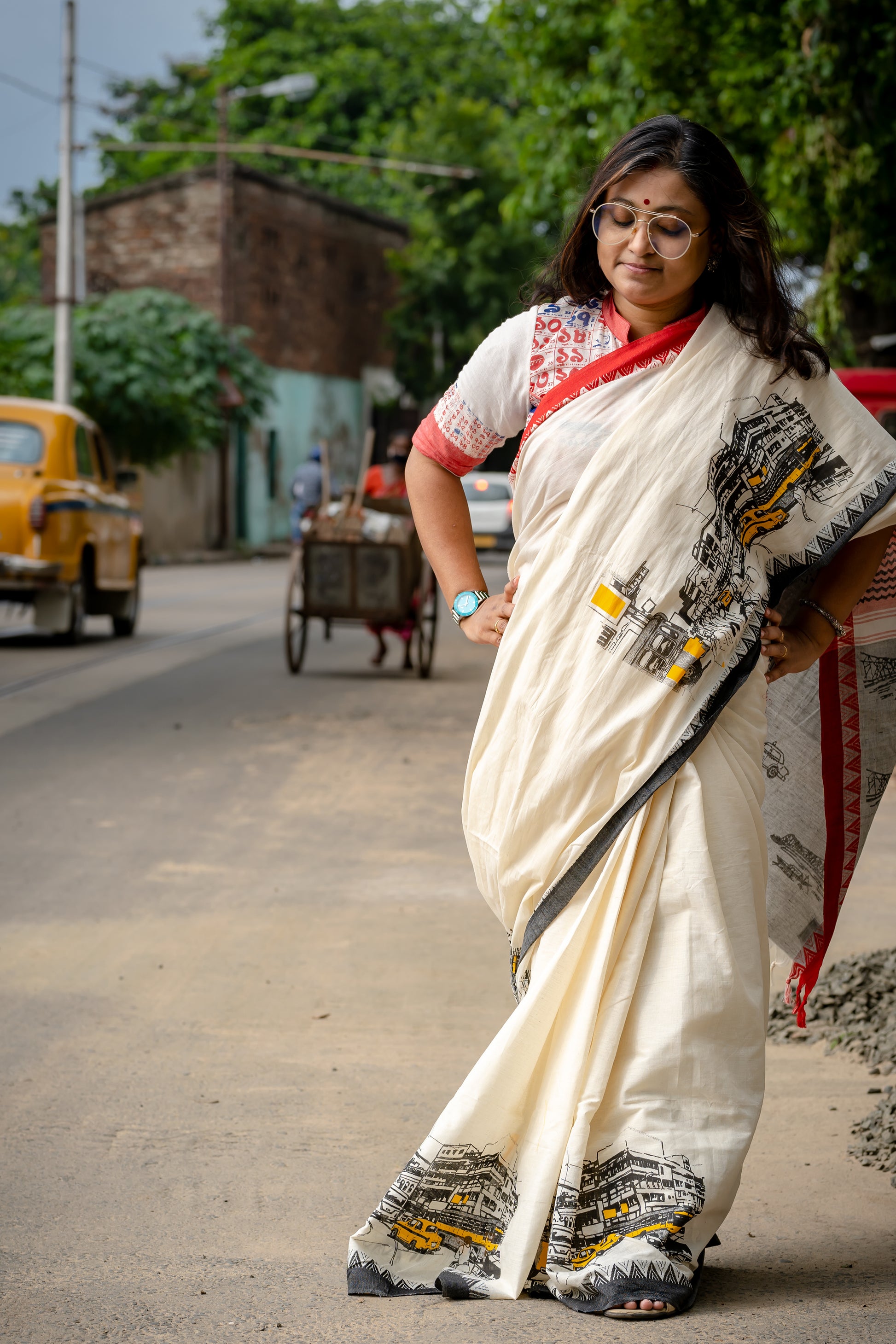 The relationship with Kolkata and me is that of mother and daughter. I had disliked it and wanted to runaway only to realize how much I love her. She like a mother has taught me life lessons. Now I know that we are inseparable, tied by invisible umbellical cord. This saree is avialable in 4 varieties, handspun handwoven cotton with woven Ganga Yamuna border (avialable in 2 colours), and on linen (available in 2 colours)
