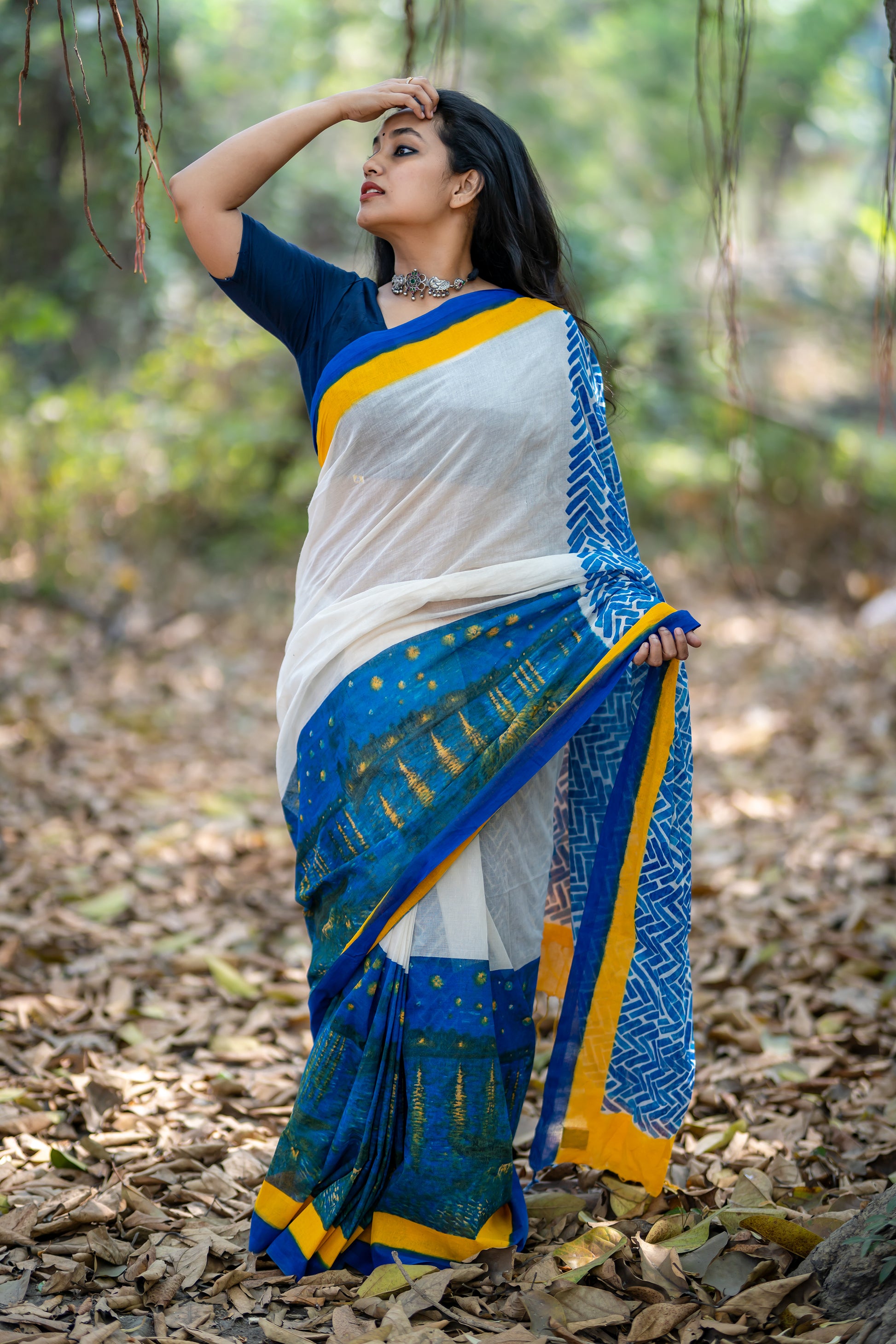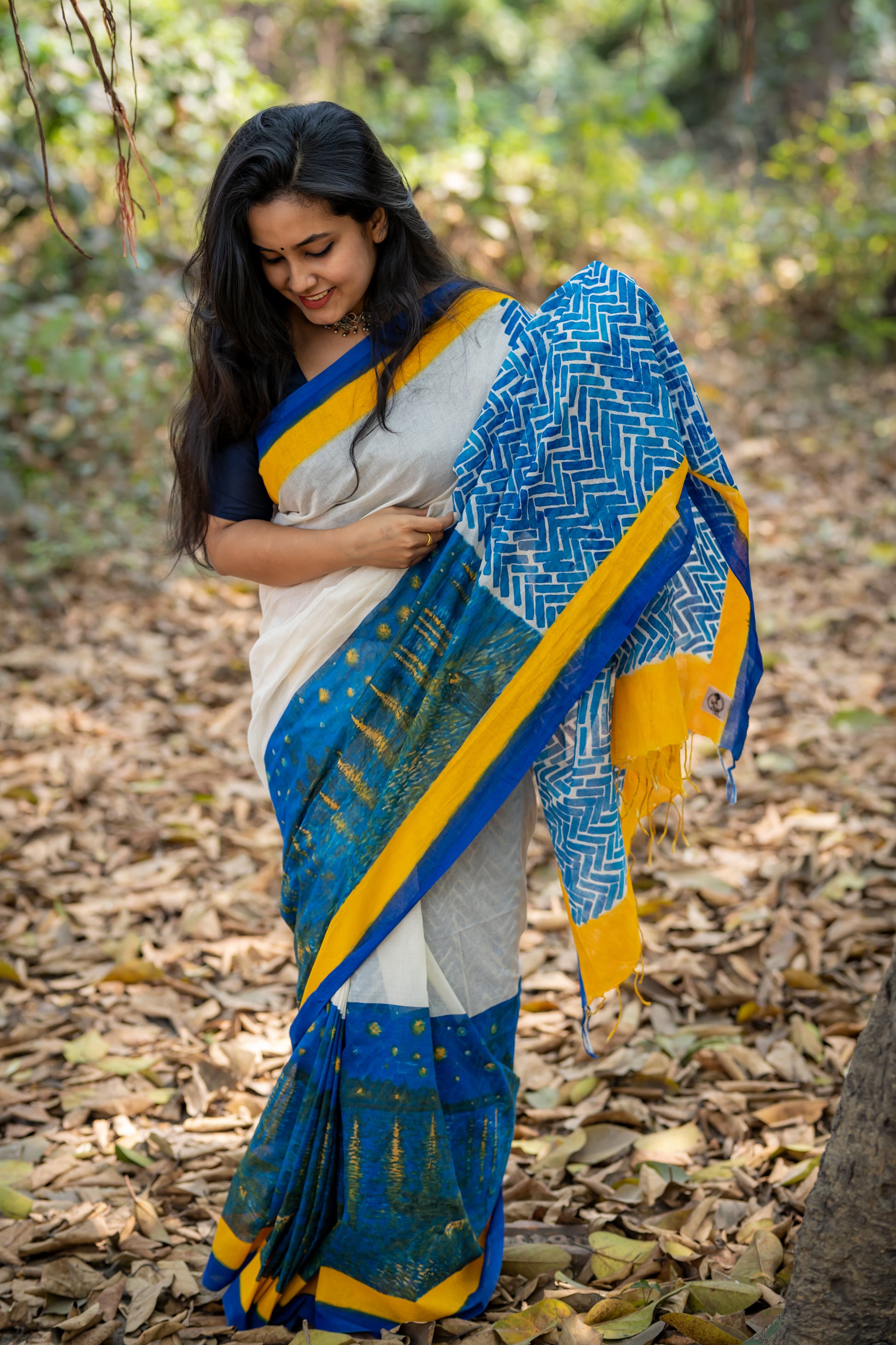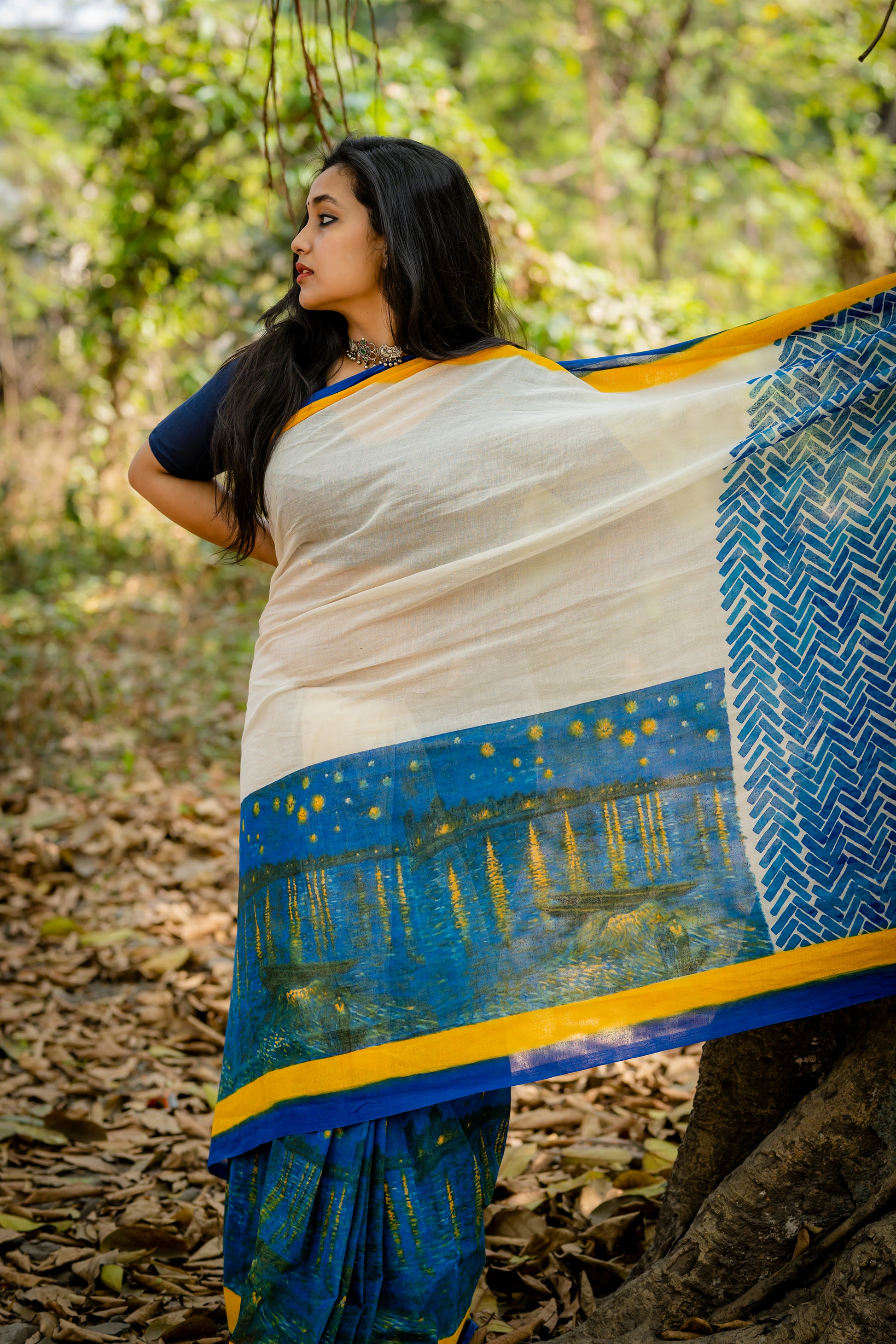 Vincent Van Gogh’s Starry night on Rhone is a painting that has many layers. The saree is thus a wearable painting on a handspun handwoven cotton.