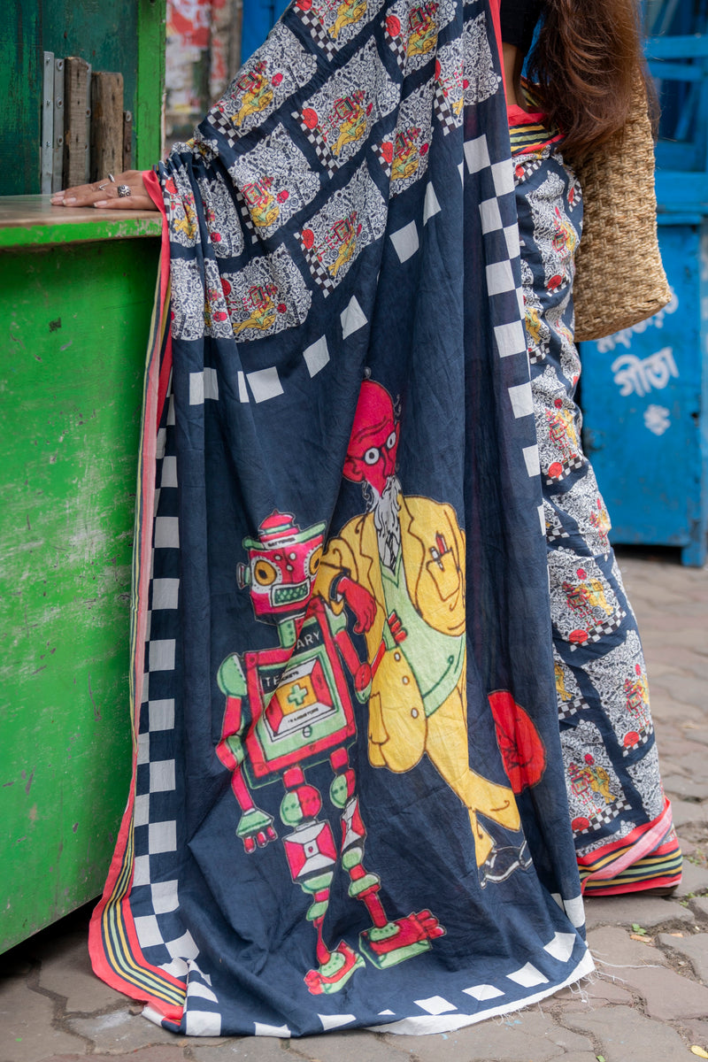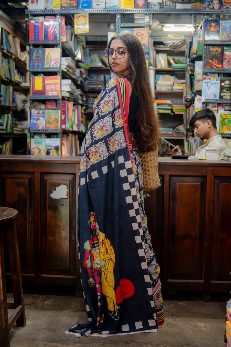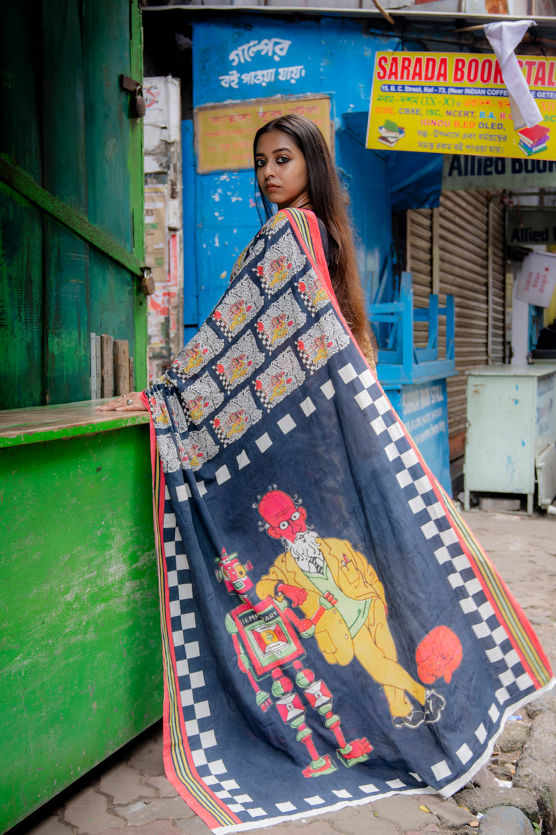handwoven cotton saree depicting the Ray elements of professor's life.