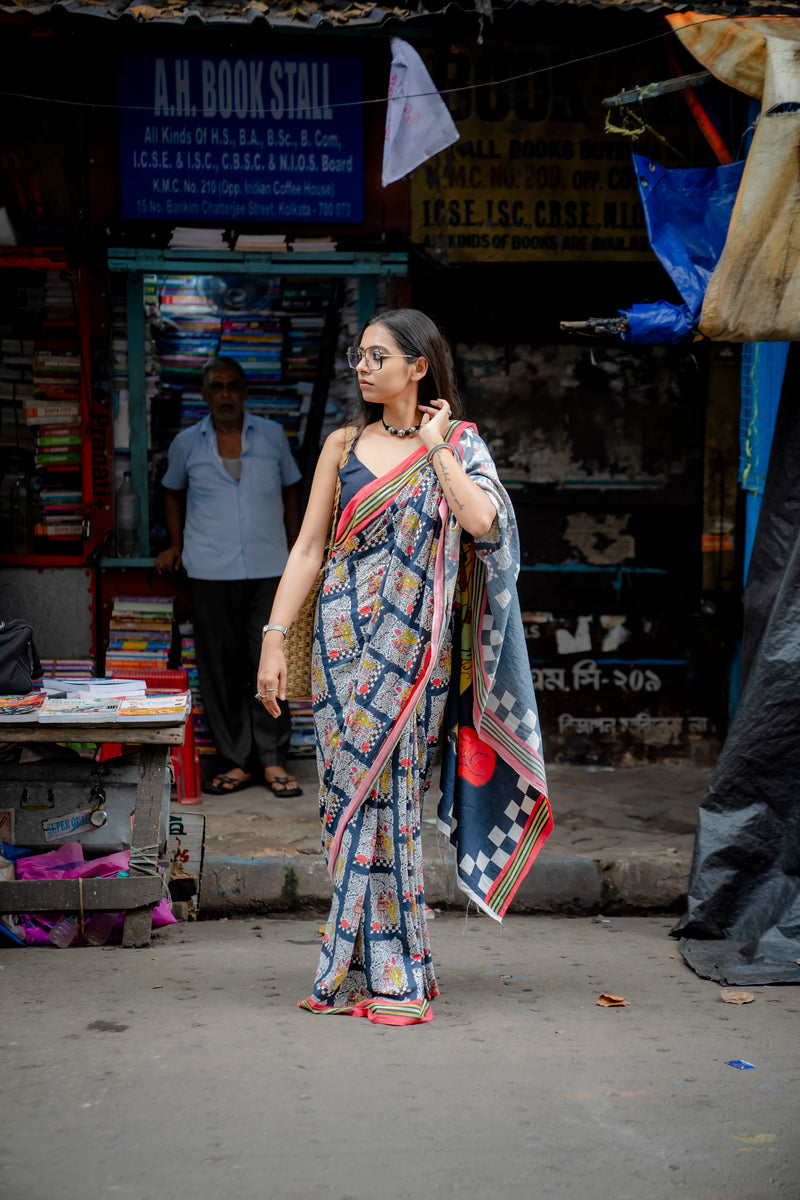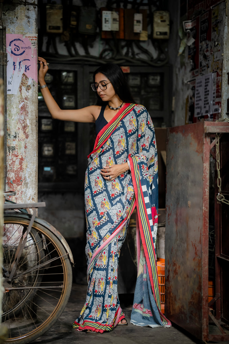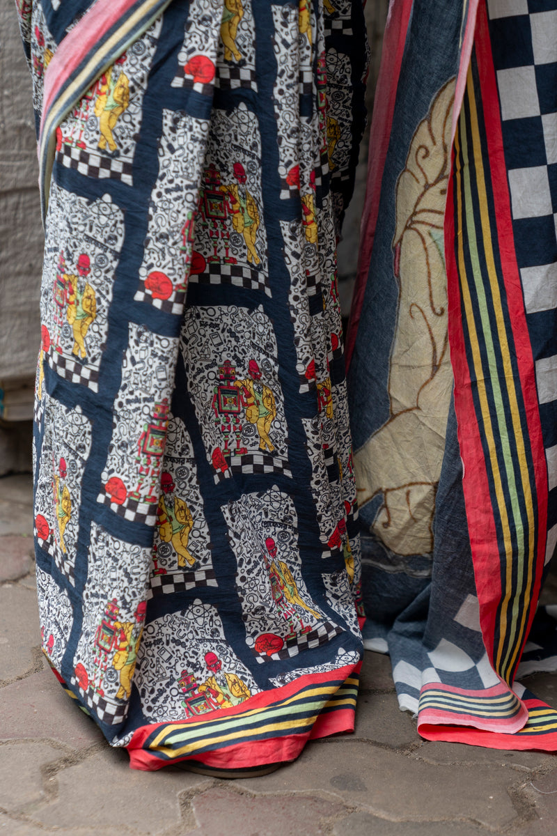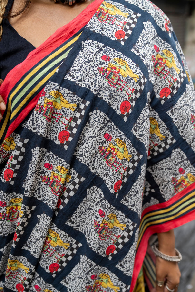 This saree feels special with its artistic and quirky prints.