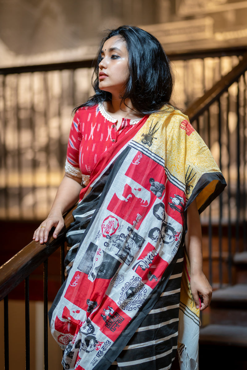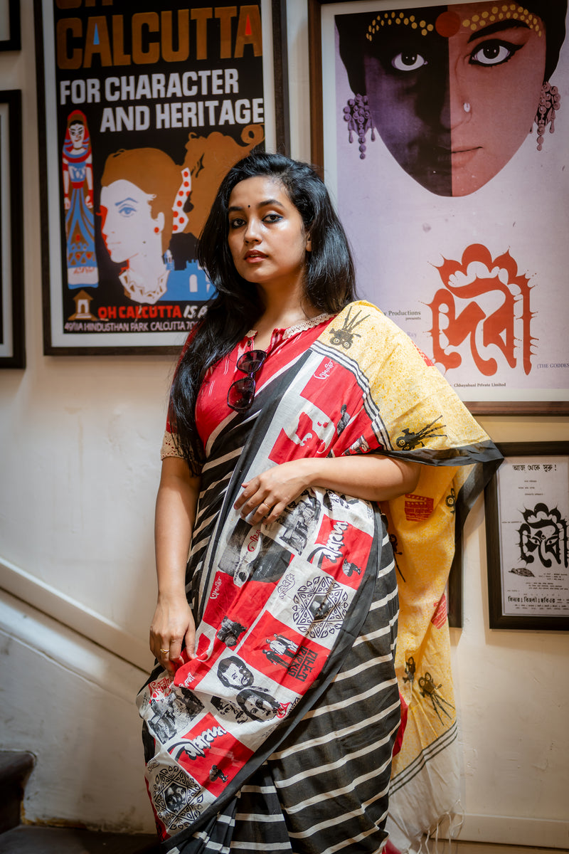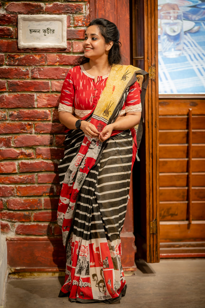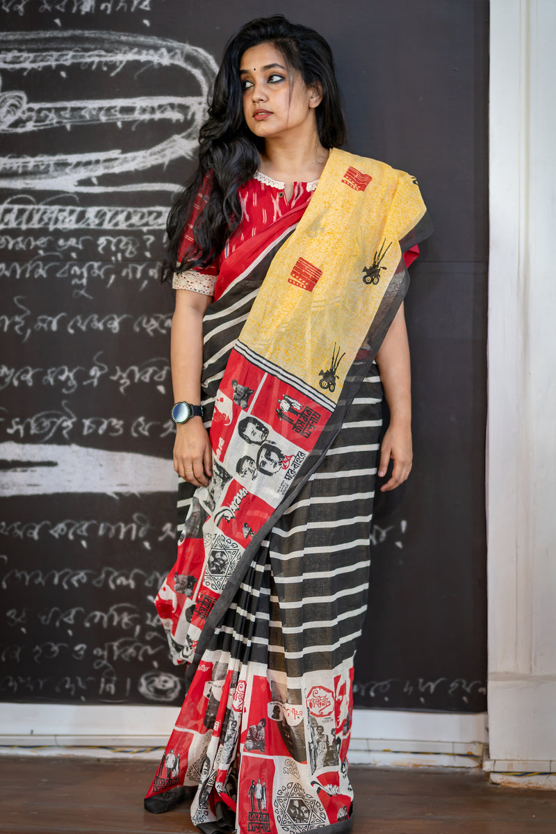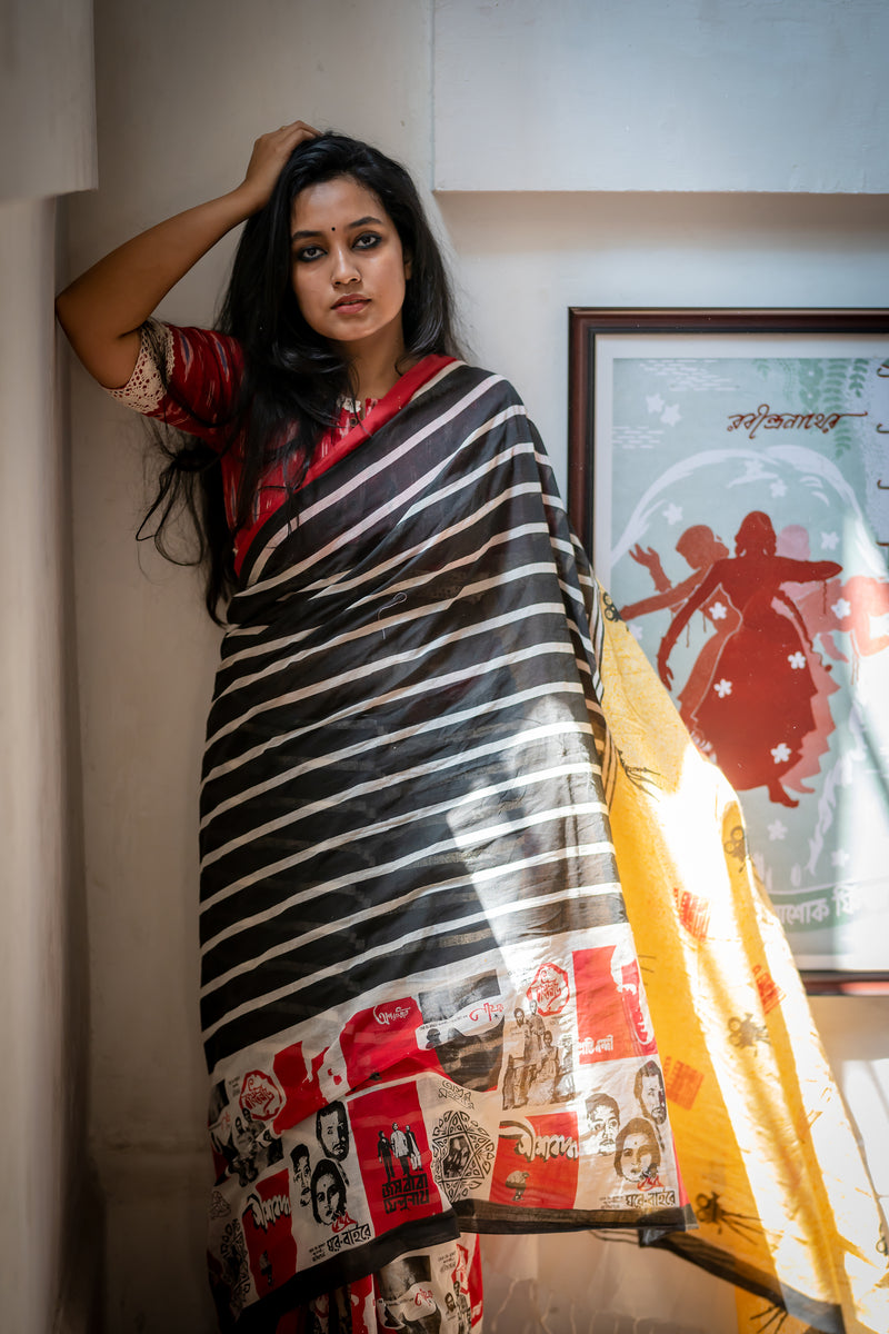 A tribute to the Maestro on his birth centenary, a handspun handwoven cotton saree with printed posters from his various films.