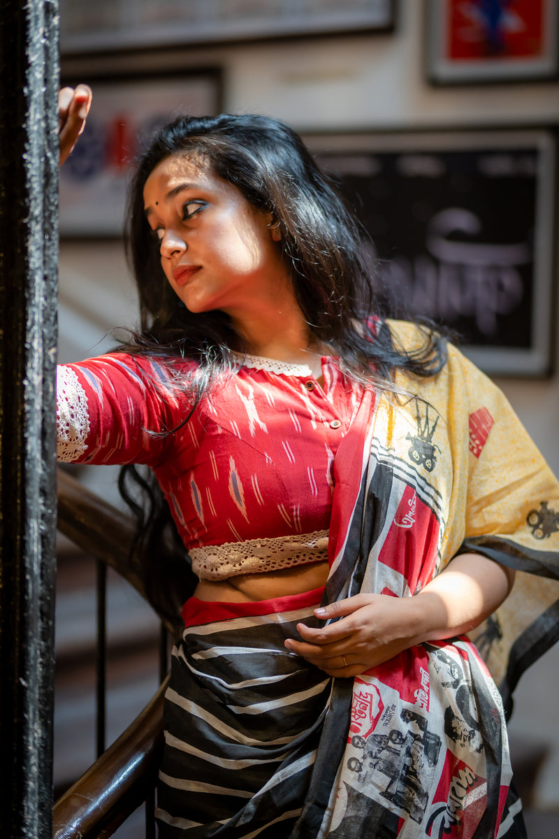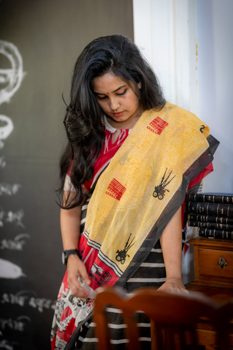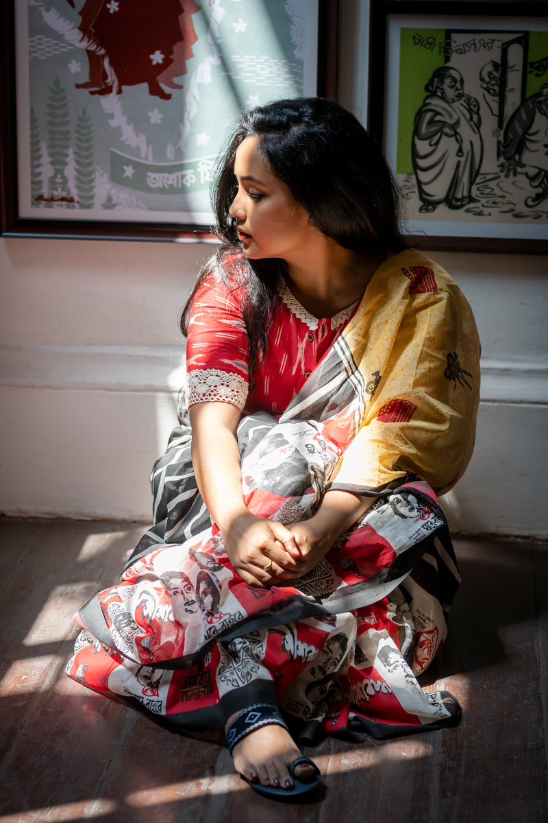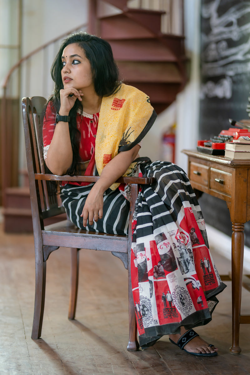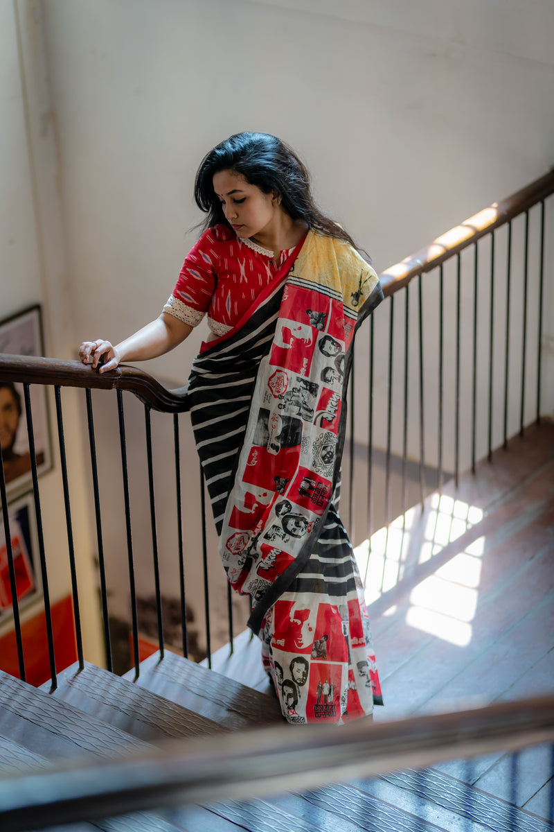 A tribute to the Maestro on his birth centenary, a handspun handwoven cotton saree with printed posters from his various films.