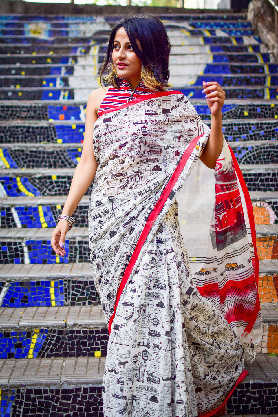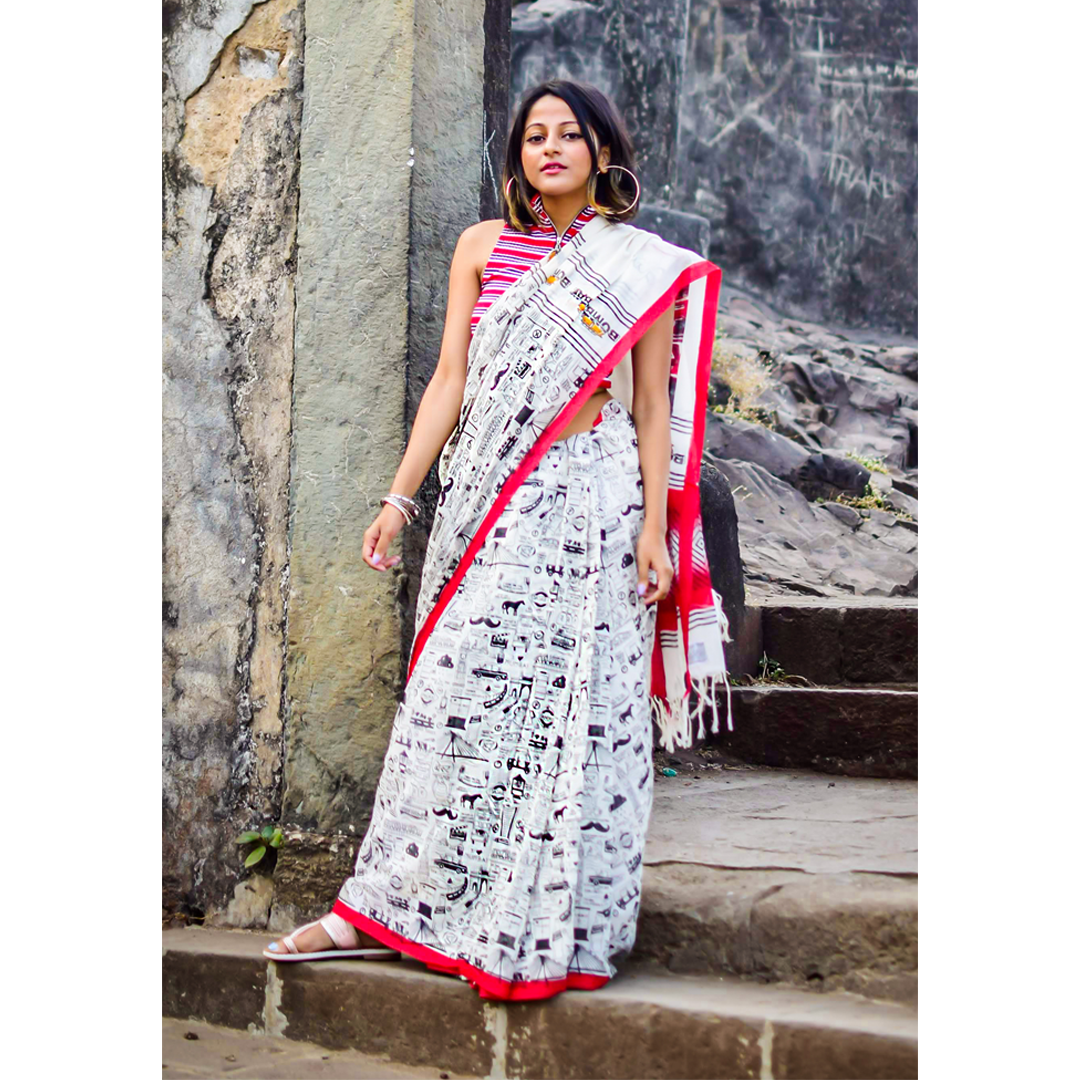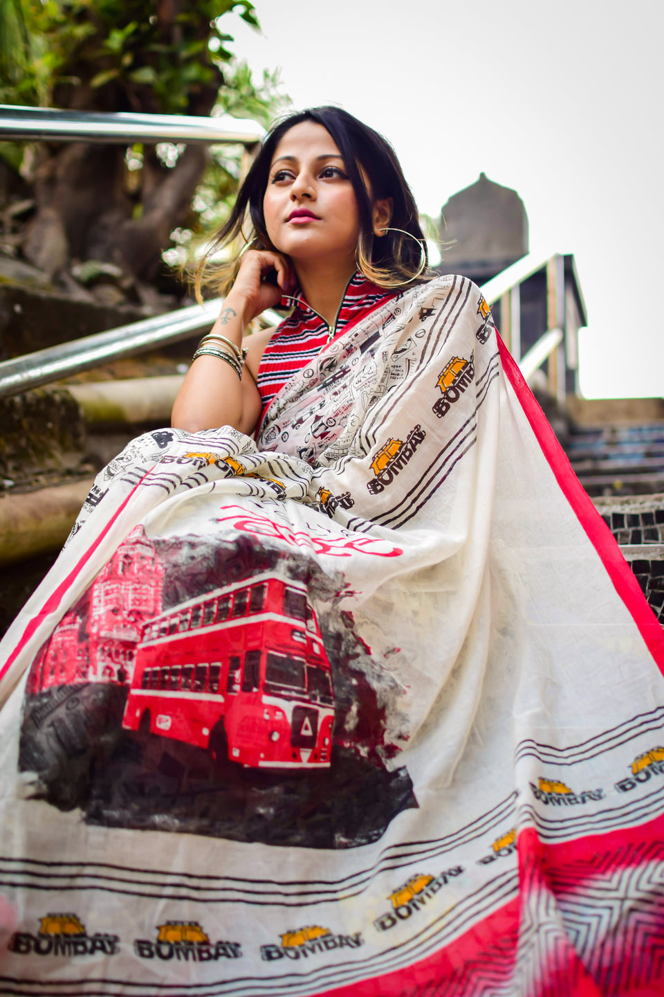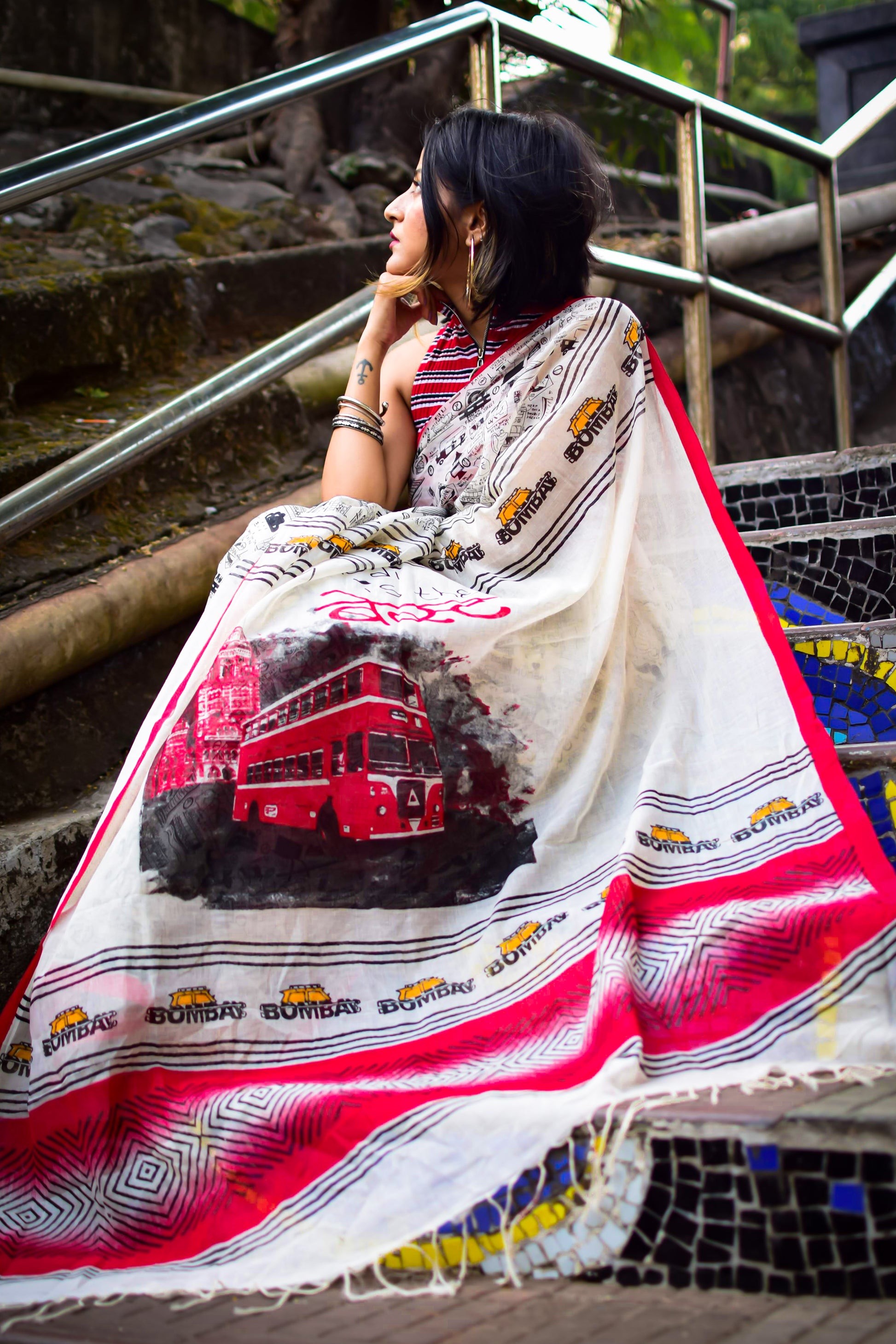 Bombay is a city of dreams…. Its local trains and BEST buses are emotions and heart of the city. The handspun handwoven saree is a doodle print all over, with handblock prints on pallu and blouse piece.