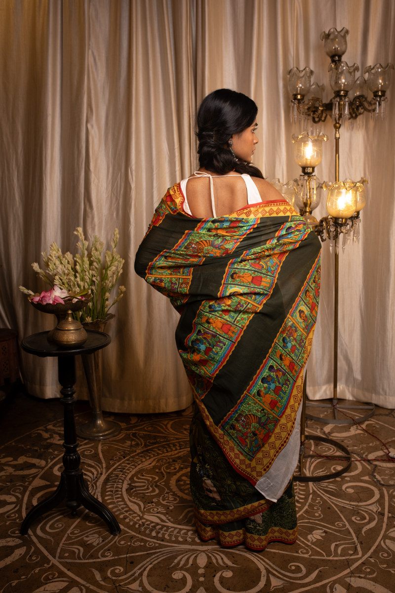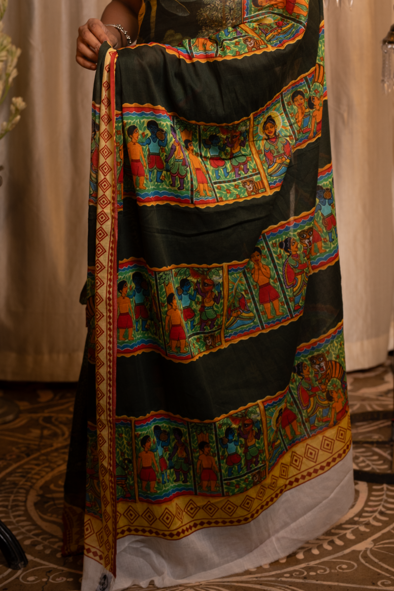 Experience the mystique and magic of the Sundarbans with our handspun, handwoven cotton saree, digitally printed to narrate the timeless tales of Bonbibi.