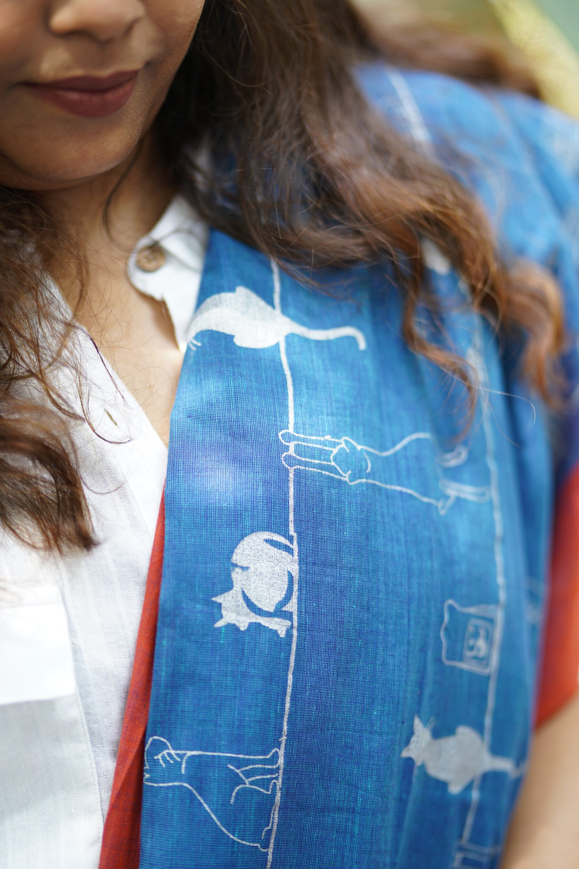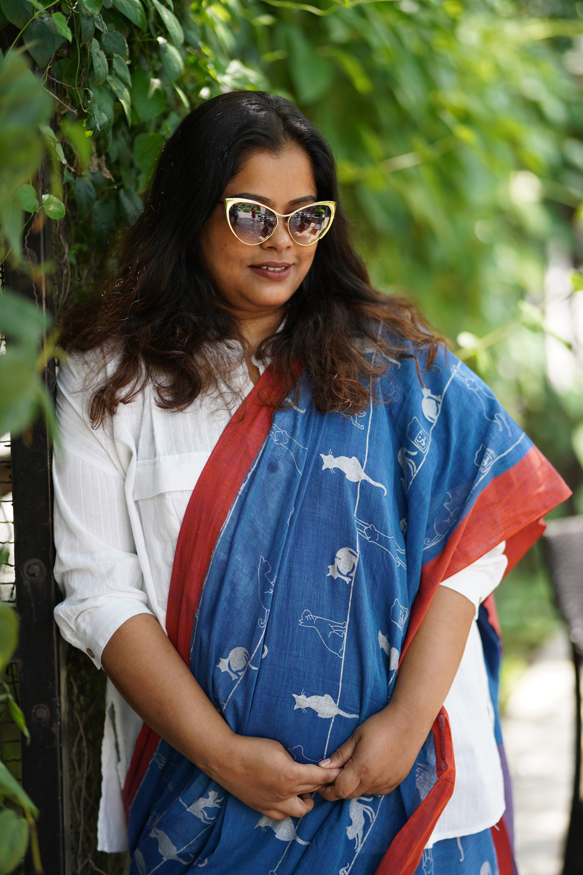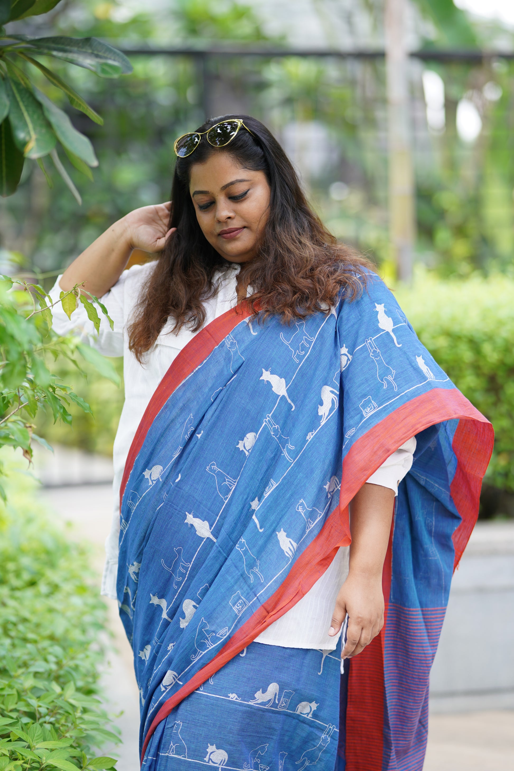 Our first cat was Ghontu. Later Shundori and her kids Chomchom and Pompom joined the family. This saree is for all cat parents who wants to keep those bundles of joy close to their heart. The saree is a Handspun handwoven cotton with screen and block printed cat motifs.