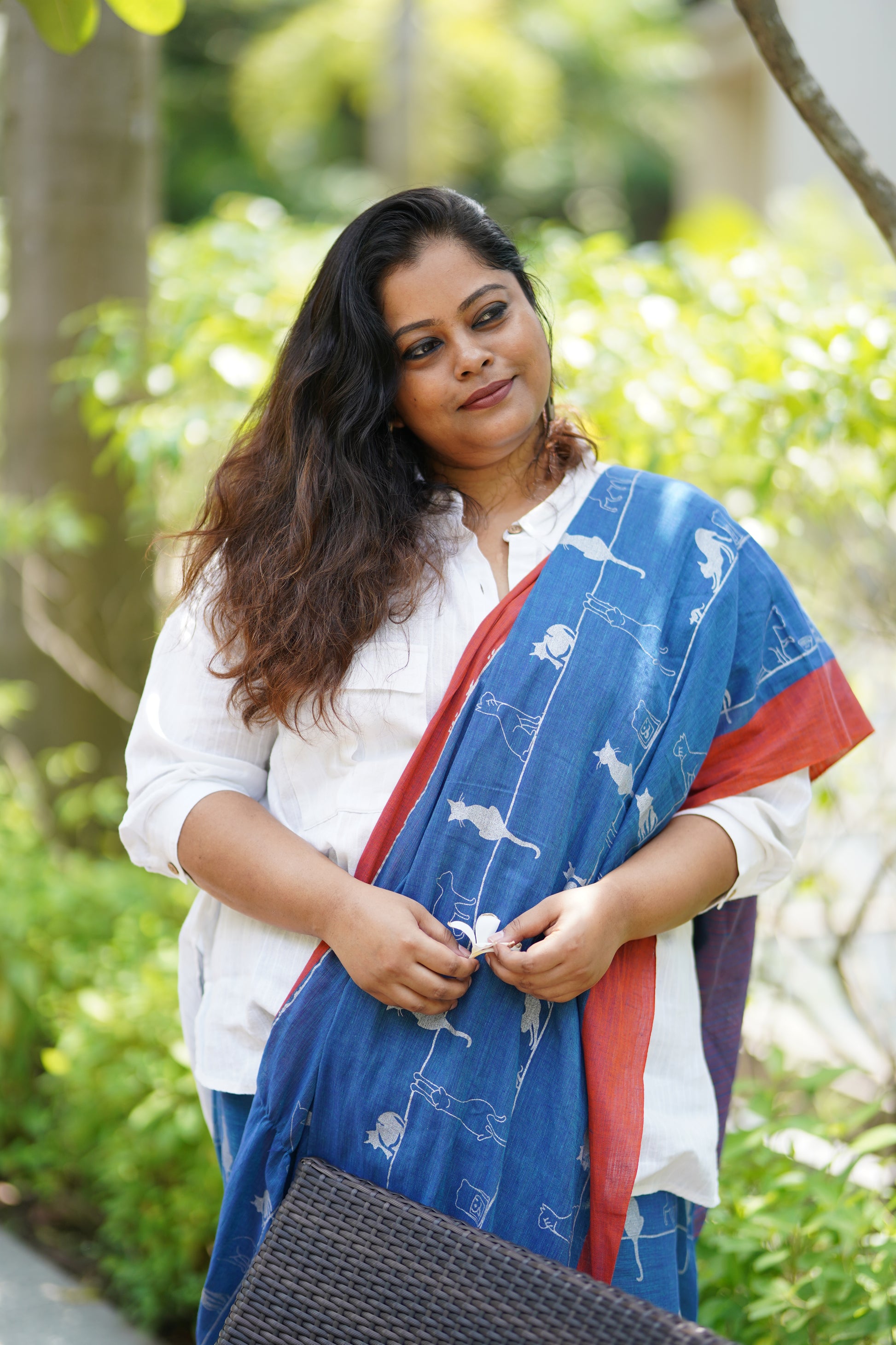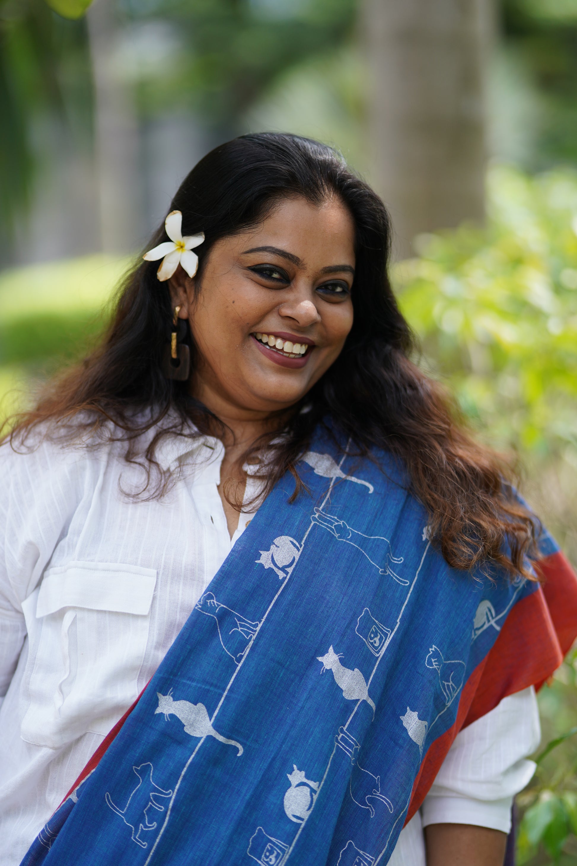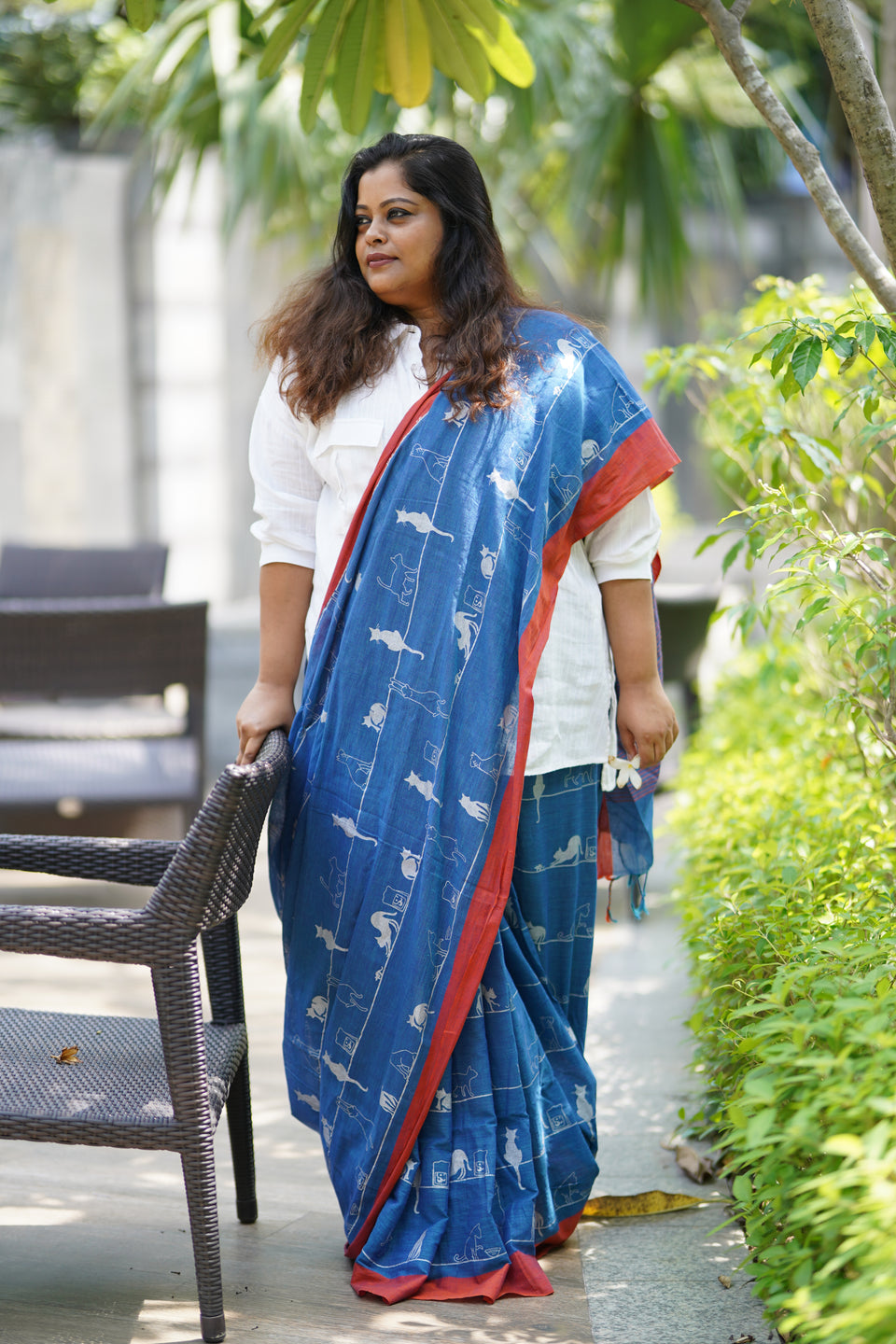 Our first cat was Ghontu. Later Shundori and her kids Chomchom and Pompom joined the family. This saree is for all cat parents who wants to keep those bundles of joy close to their heart. The saree is a Handspun handwoven cotton with screen and block printed cat motifs.