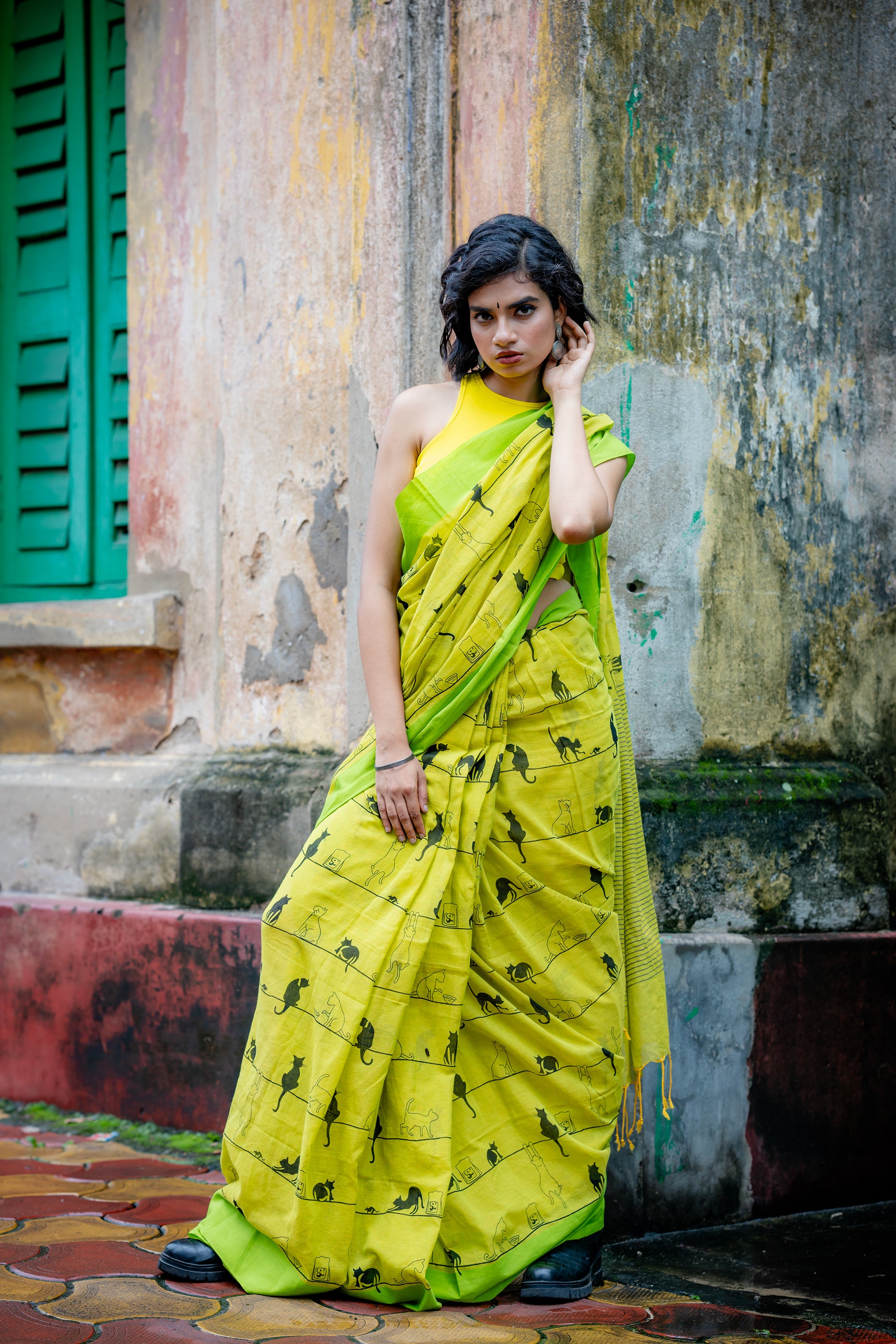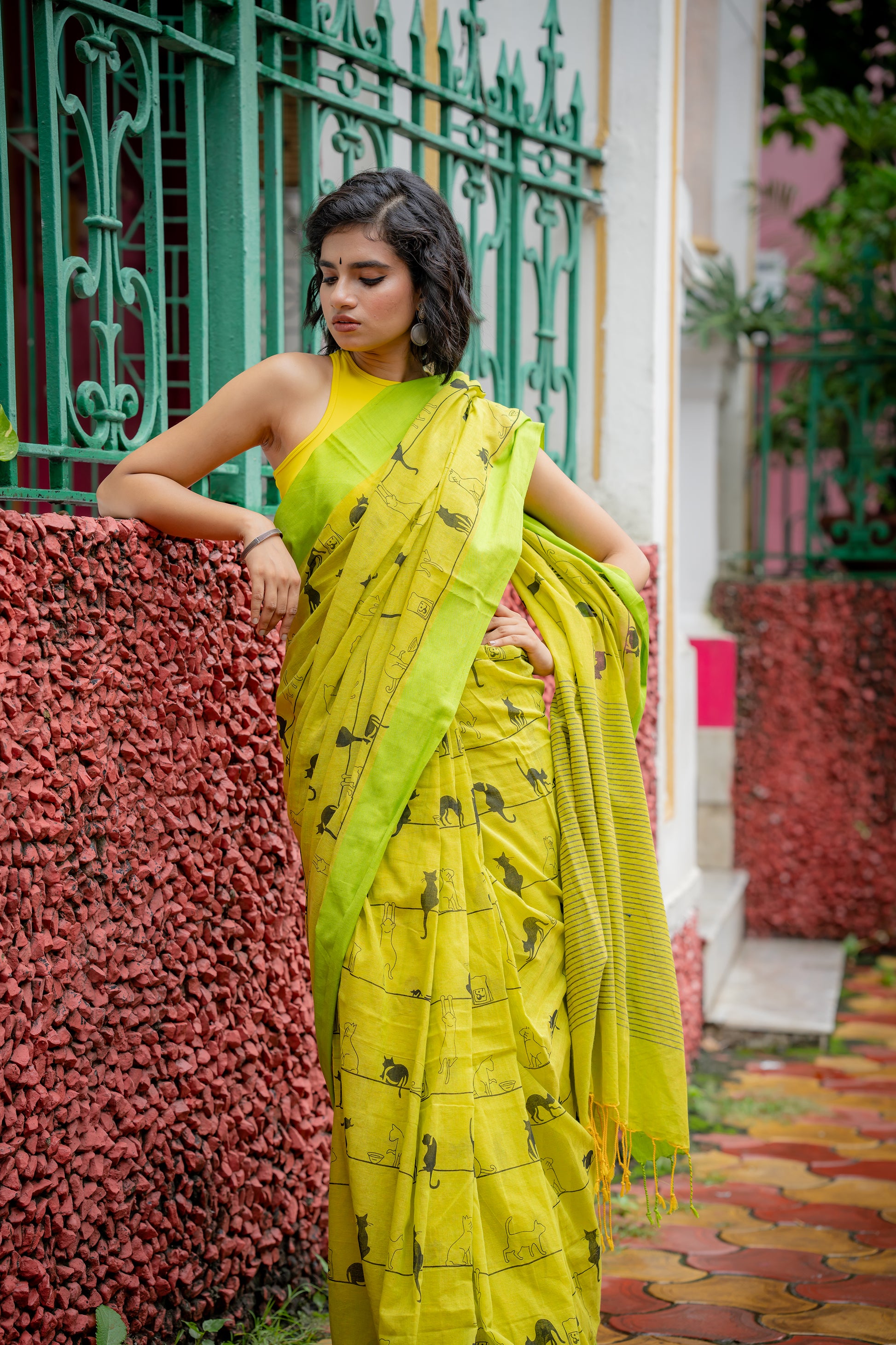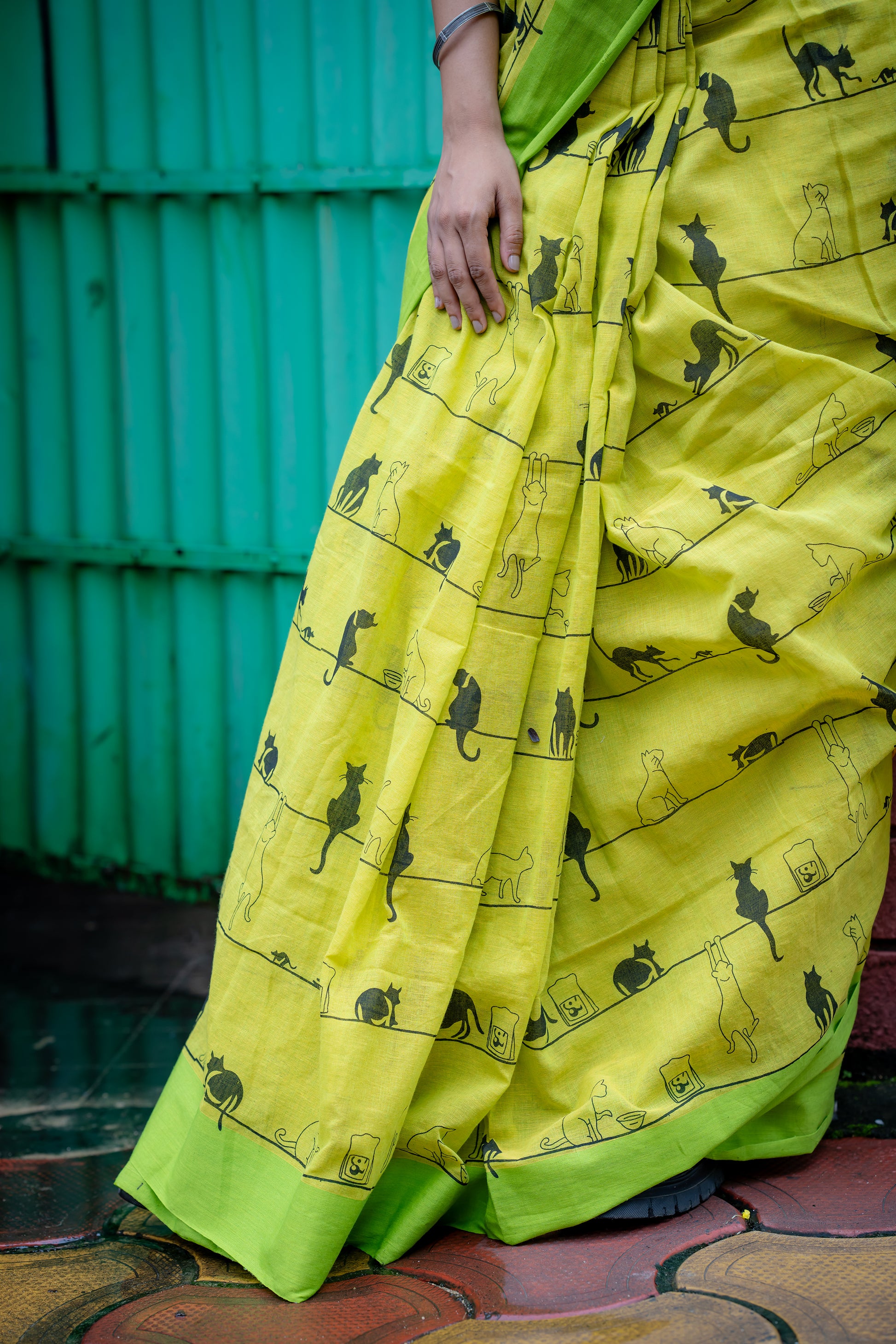 This green cotton saree features an adorable cat print, adding a playful touch to your wardrobe. The charming design celebrates feline grace and personality, making it a fun and stylish choice for any occasion.