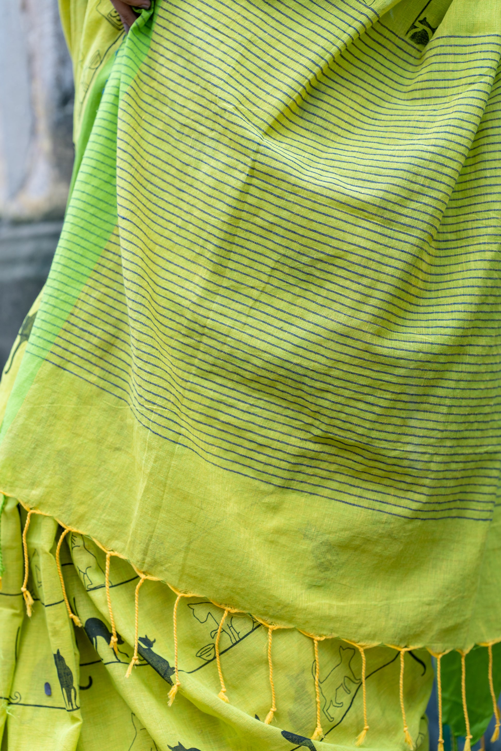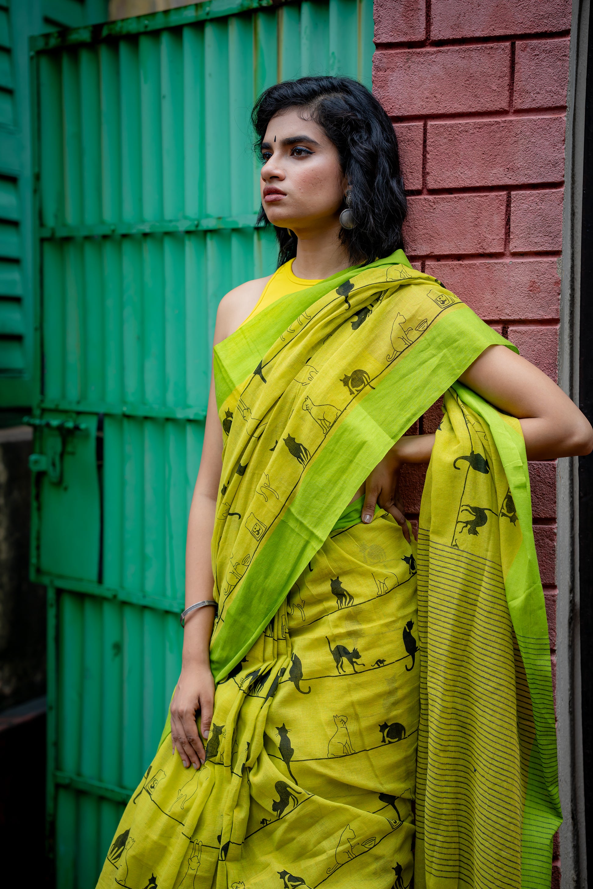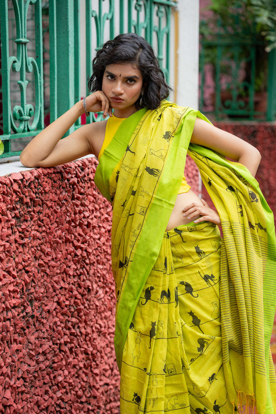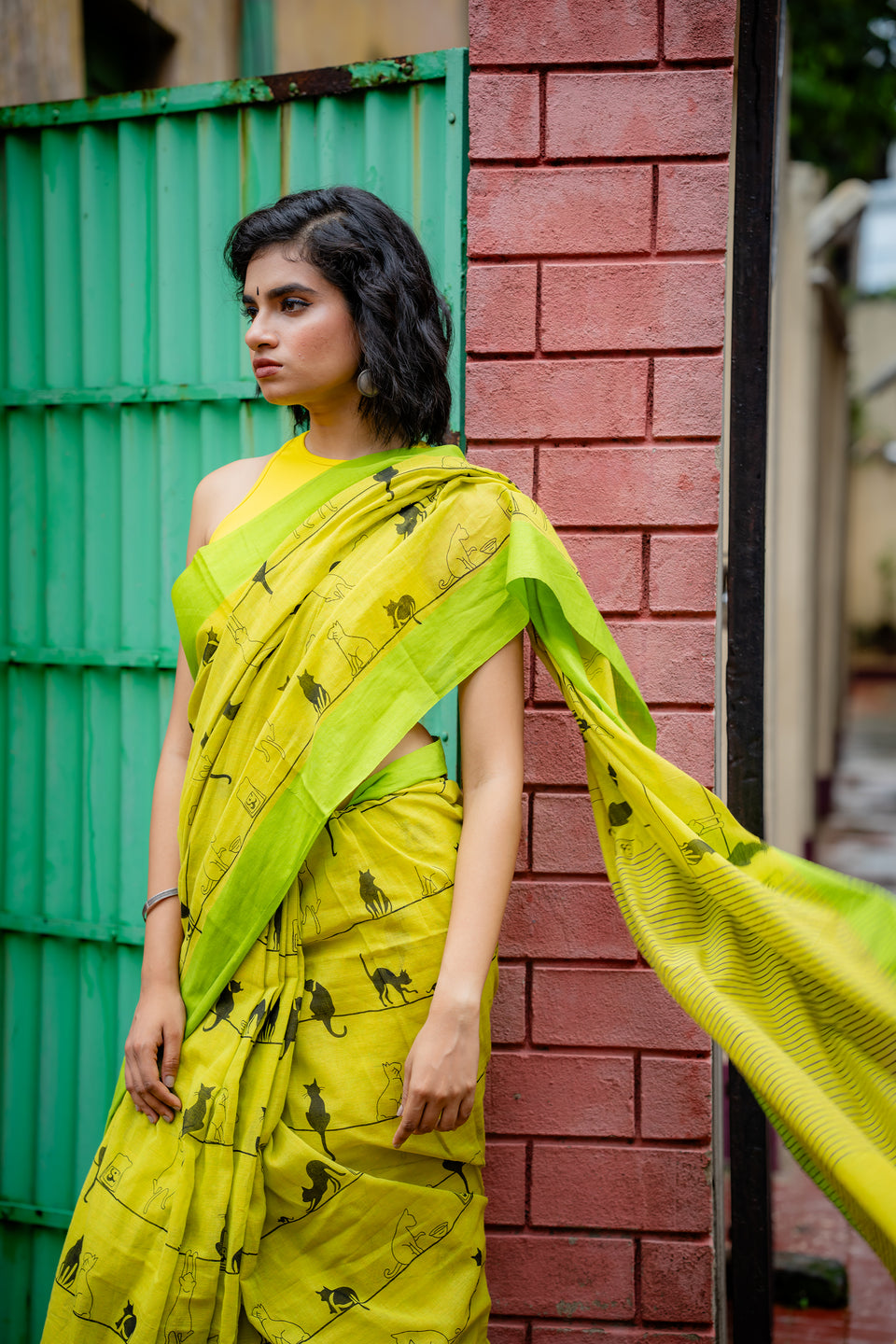This green cotton saree features an adorable cat print, adding a playful touch to your wardrobe. The charming design celebrates feline grace and personality, making it a fun and stylish choice for any occasion.