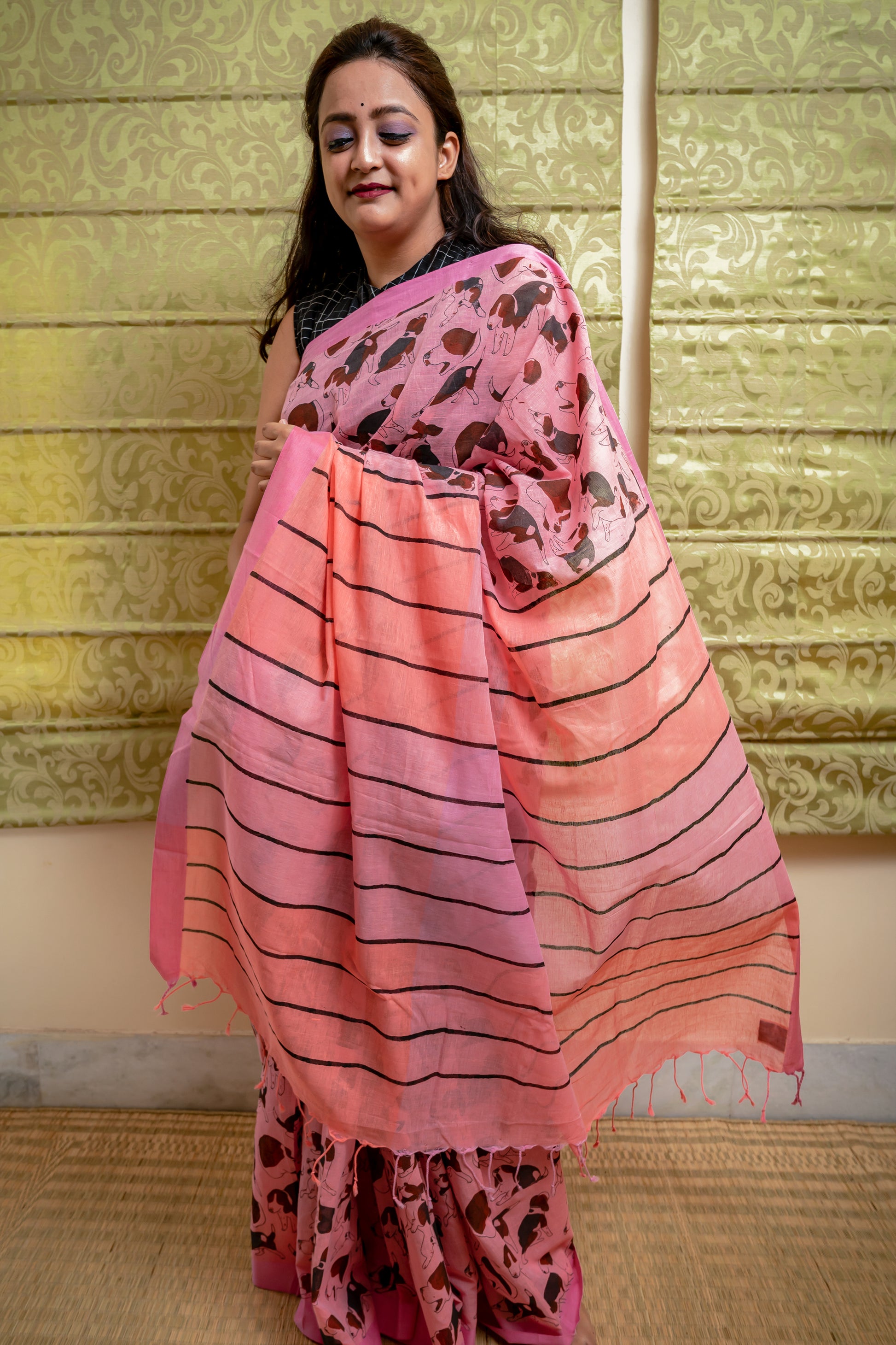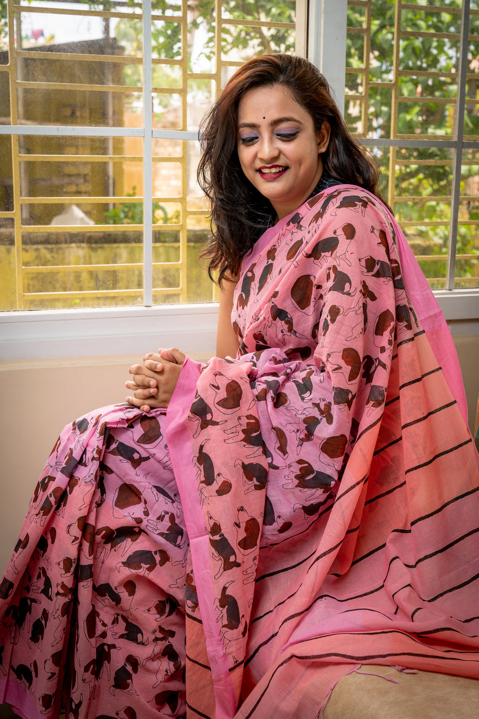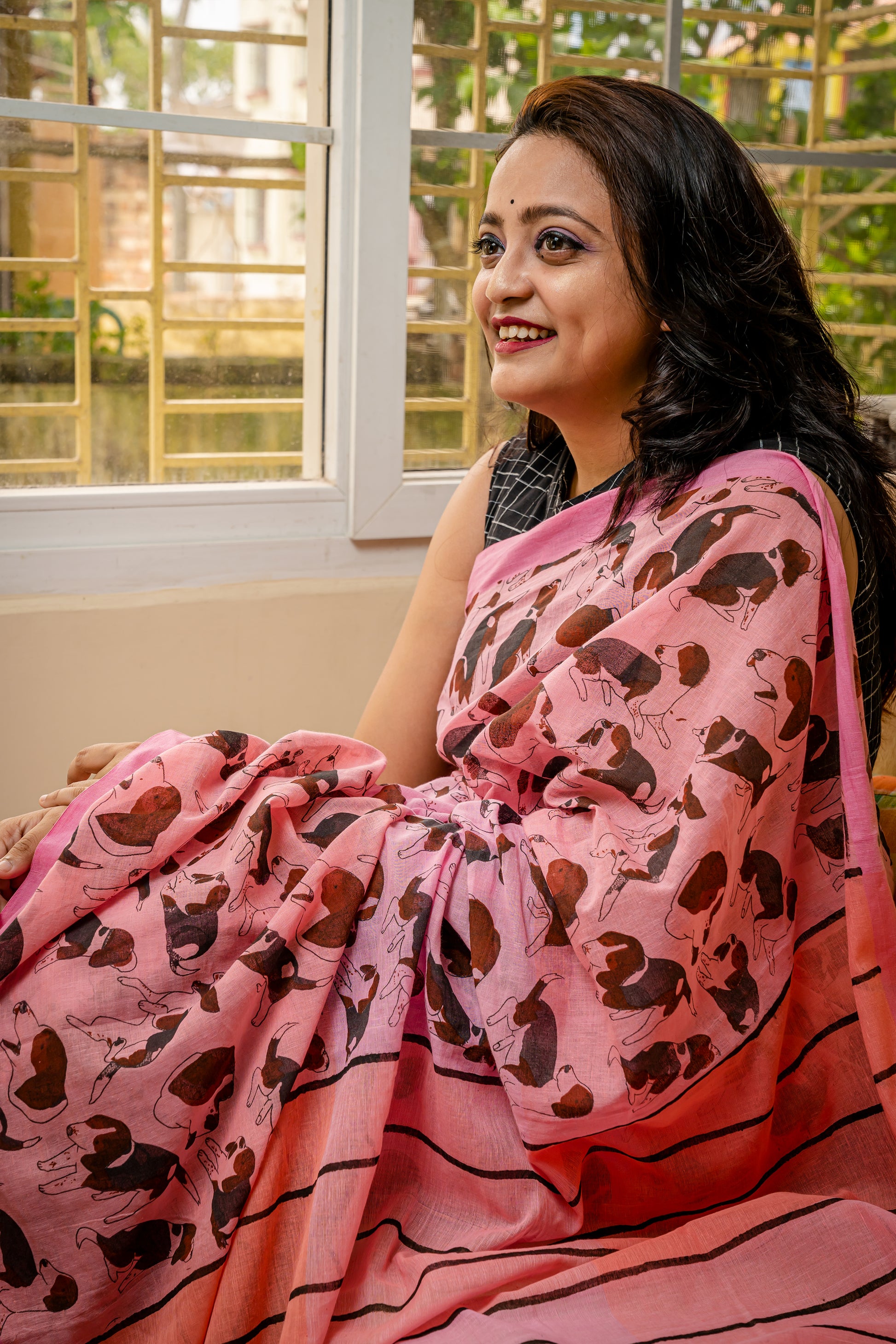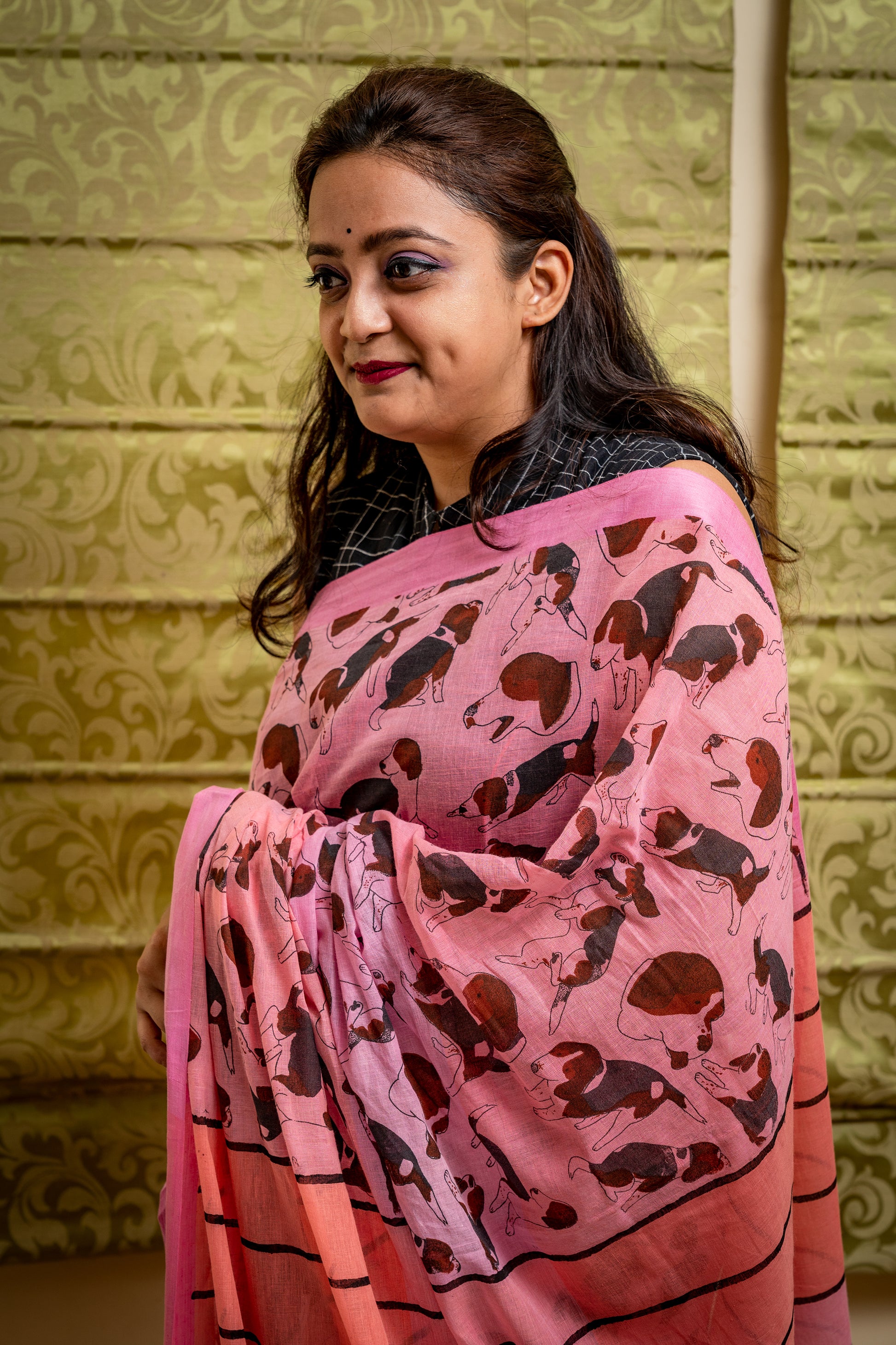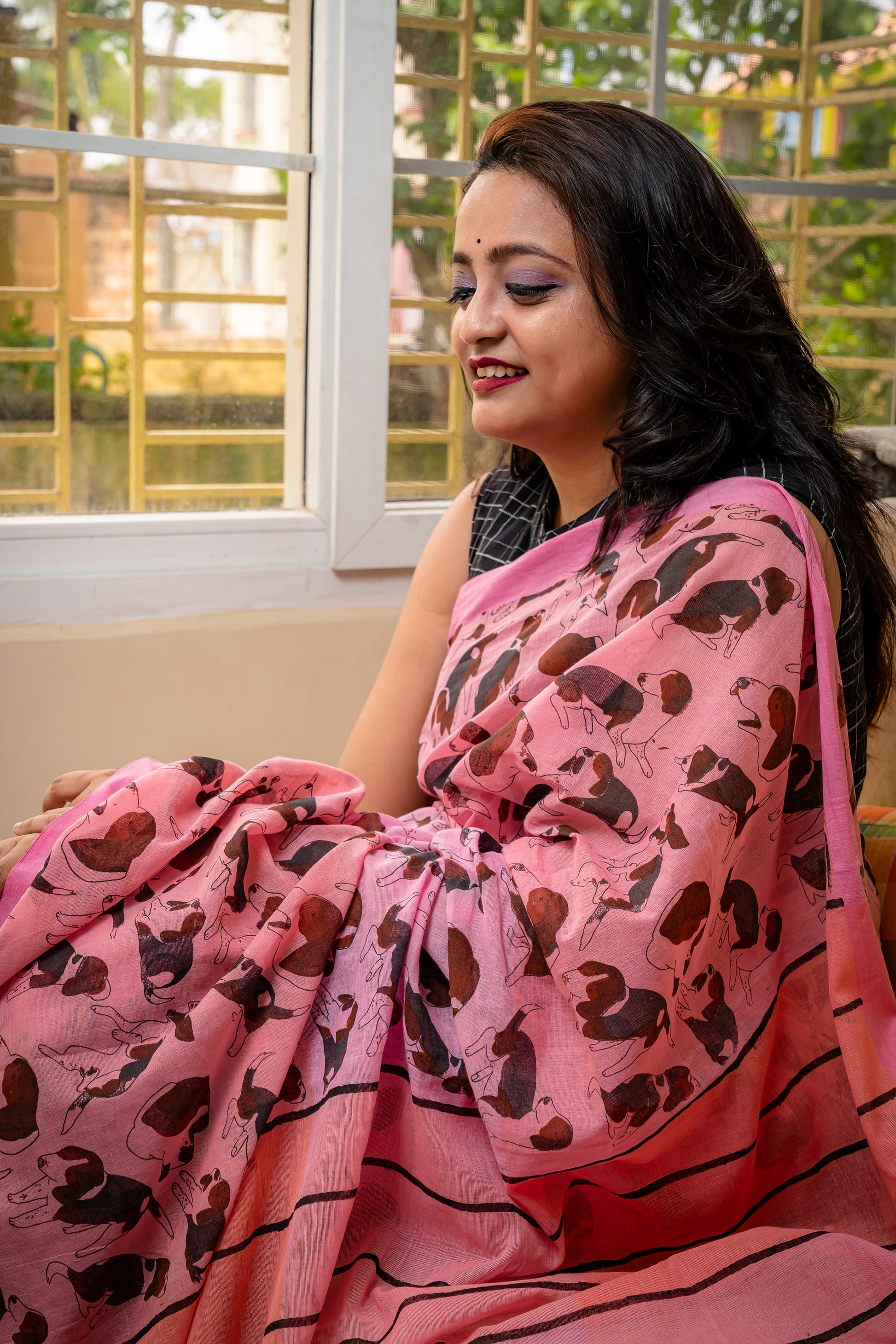 We always had dogs as pets at home. Sometimes I feel I must have been a dog in my last birth. Dora was the one who was our last canine member, she spent her beautiful 13 years with us as my sister. This saree is dedicated to her. A beautiful handspun handwoven cotton saree with printed Beagles all over.