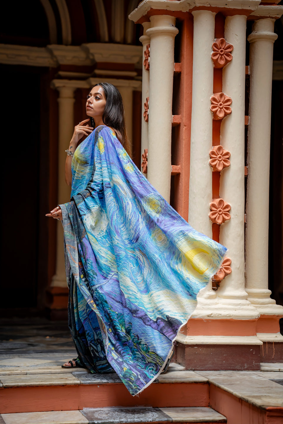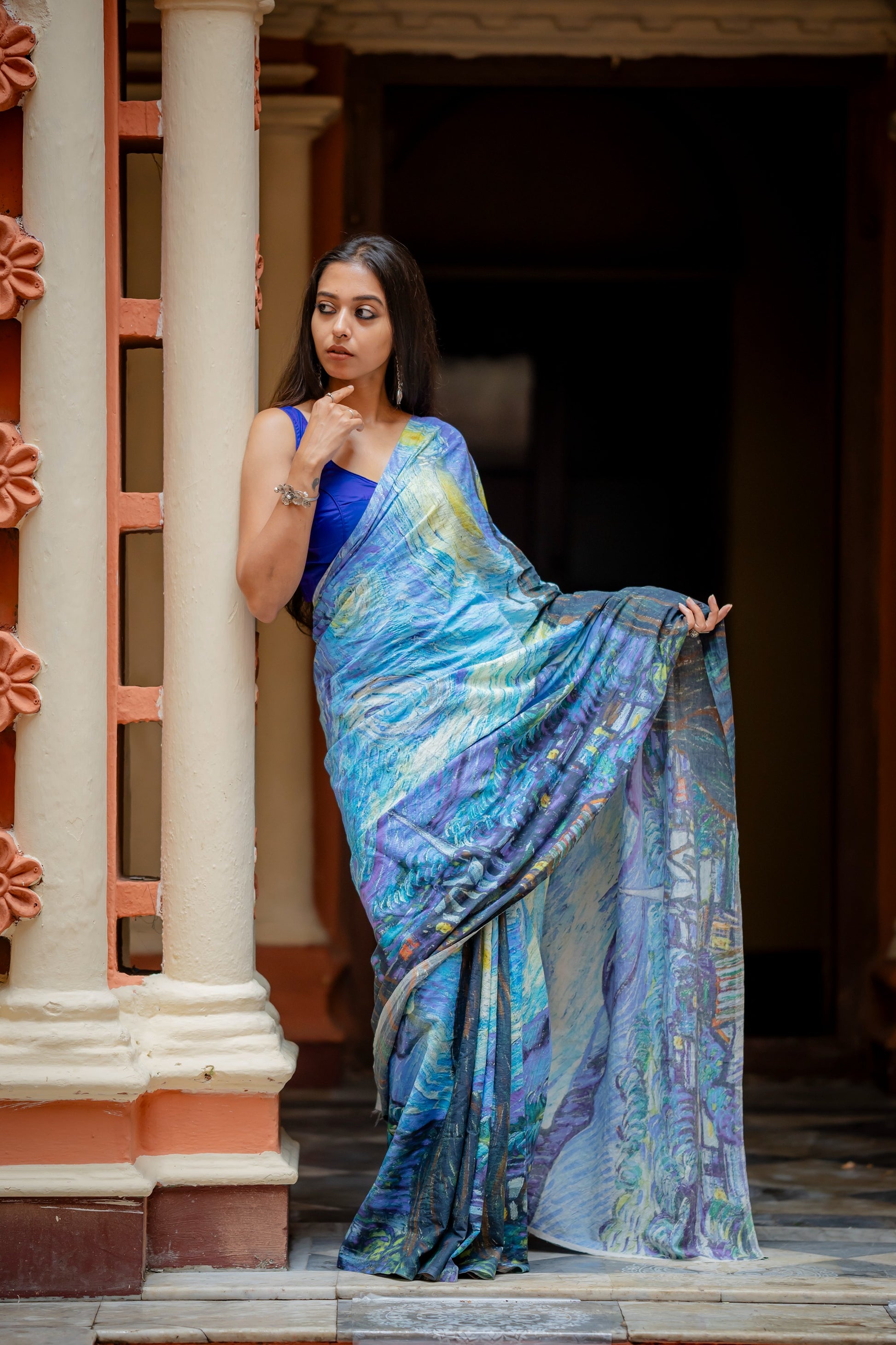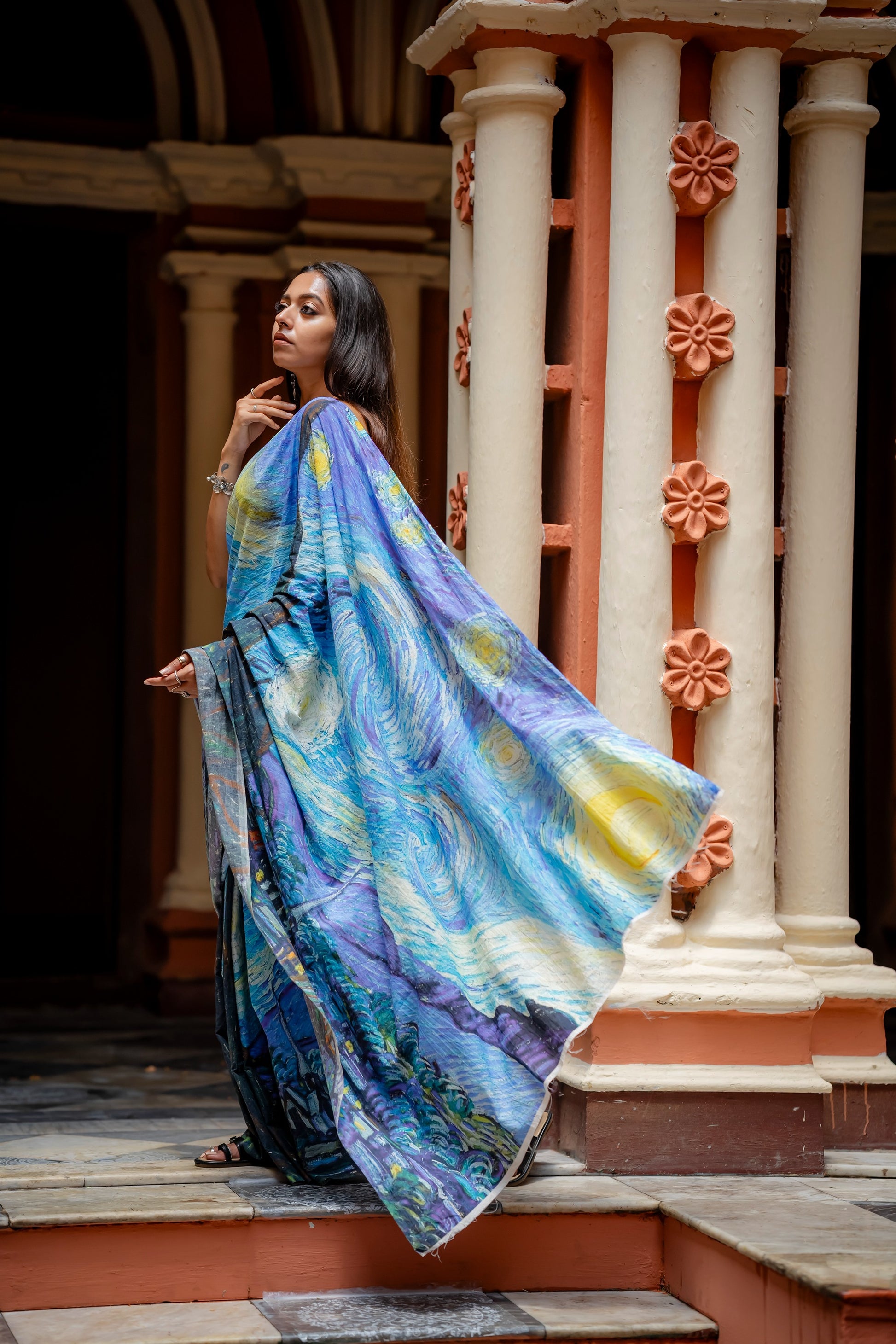 interpretation and discovery.This digital printed saree is a treat to every Van Gogh fan.