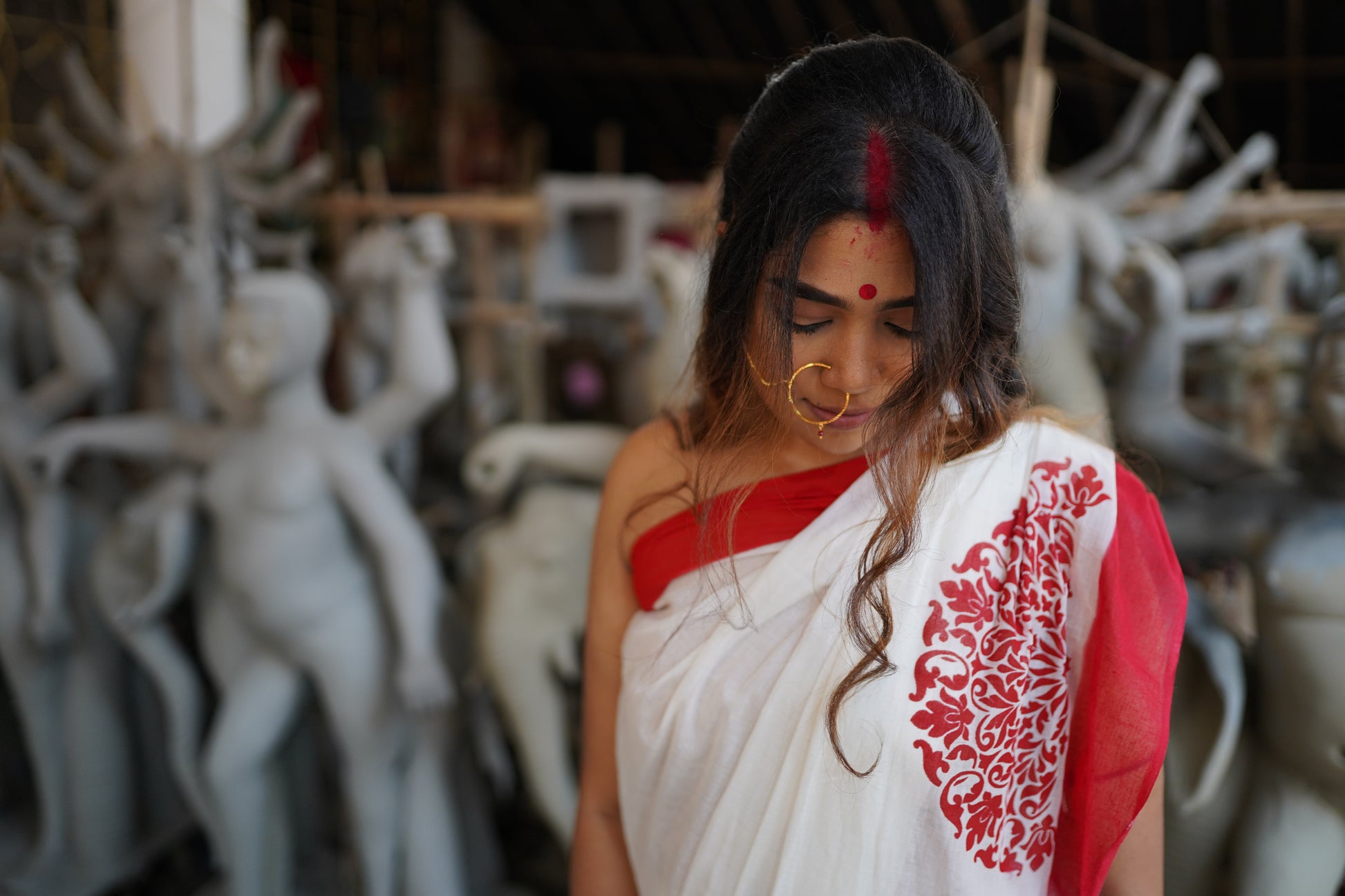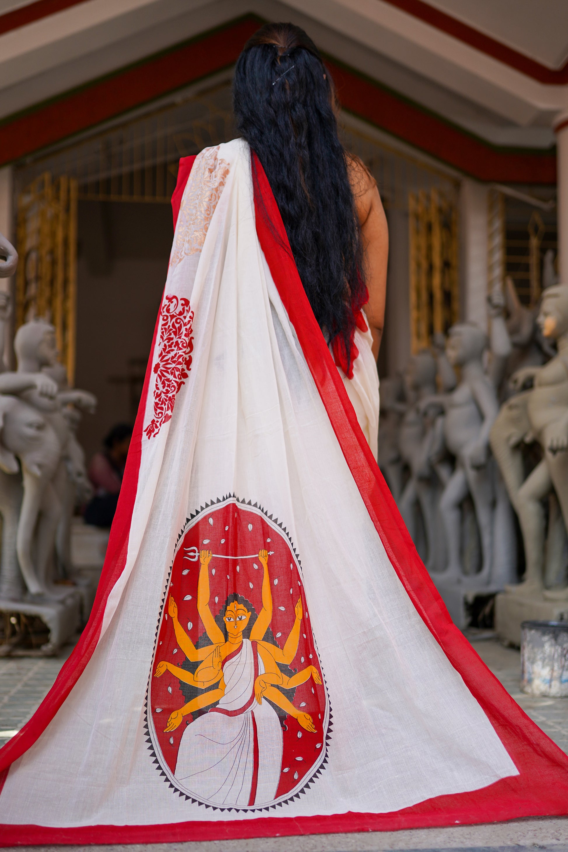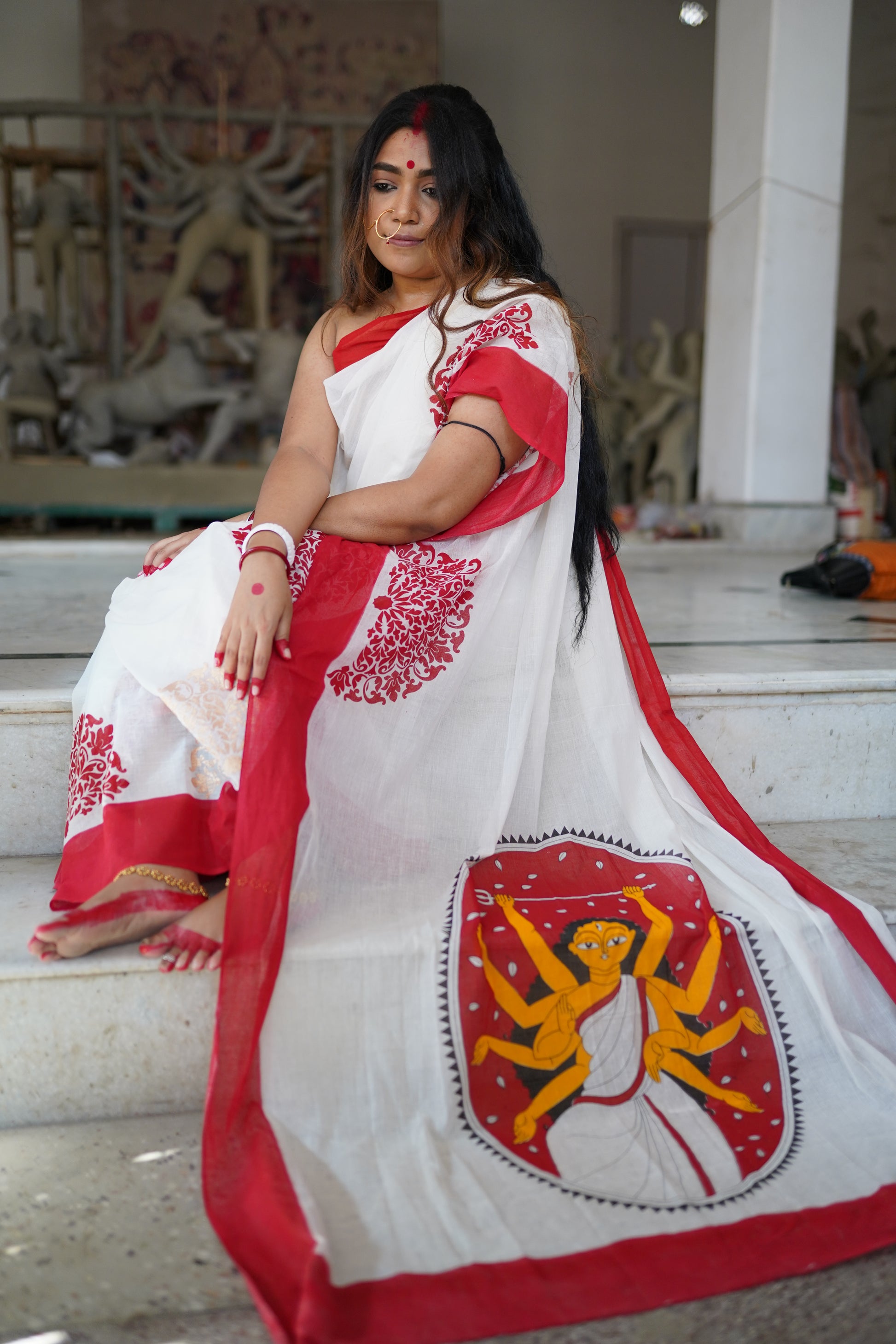 The Uma design on the pallu is unique and meaningful, perfect for Durga Puja